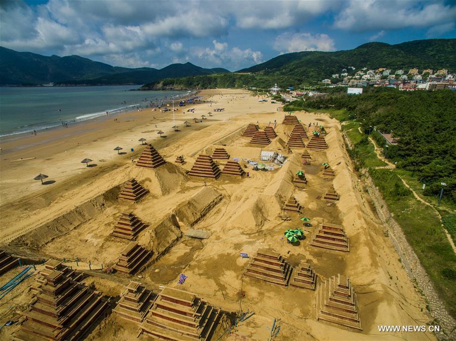 Jeroen Advocaat (R), an artist from the Netherlands, carves a sand sculpture with a Chinese artist in Zhoushan, east China's Zhejiang Province, Aug. 16, 2016. Some 20 artists around the world are building sand sculptures of landmarks of G20 countries to greet the upcoming G20 Summit in Hangzhou, capital of Zhejiang Province. The sand sculptures here are expected to open to the public on Sept. 9. (Photo/Xinhua)