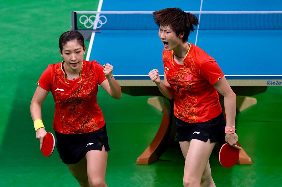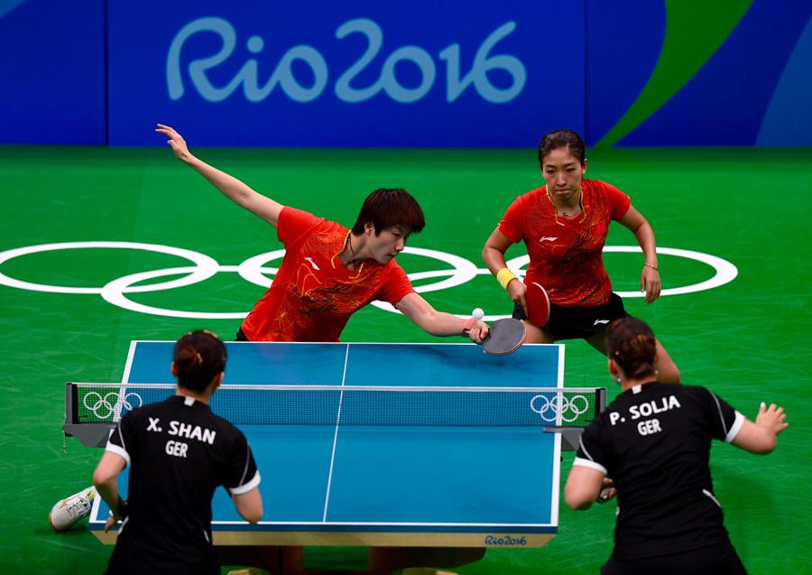 China's Liu Shiwen (L) and Ding Ning celebrate after winning a point against Petrissa Solja of Germany and Xiao Na Shan of Germany in the table tennis women's team glad medal match in Rio de Janeiro, Brazil on Aug 16, 2016. (Photo/chinadaily.com.cn)