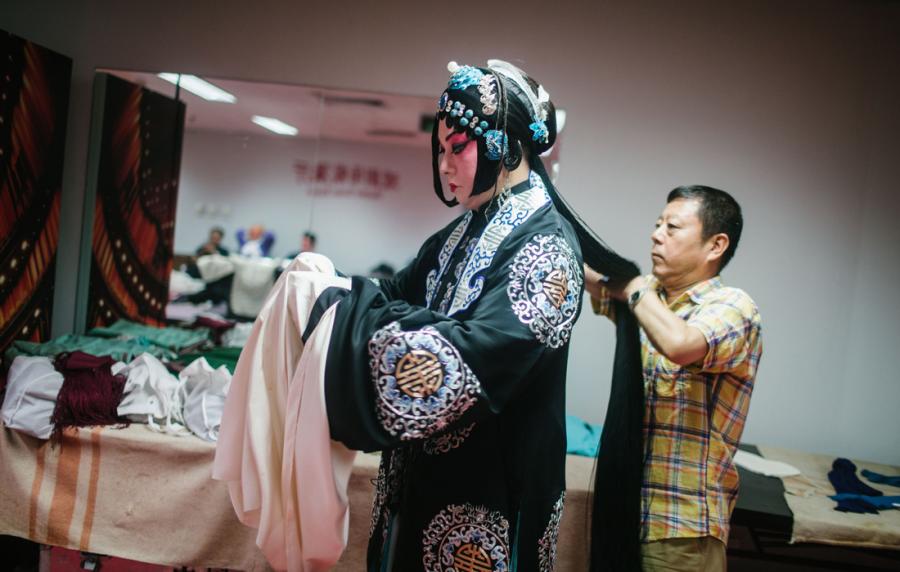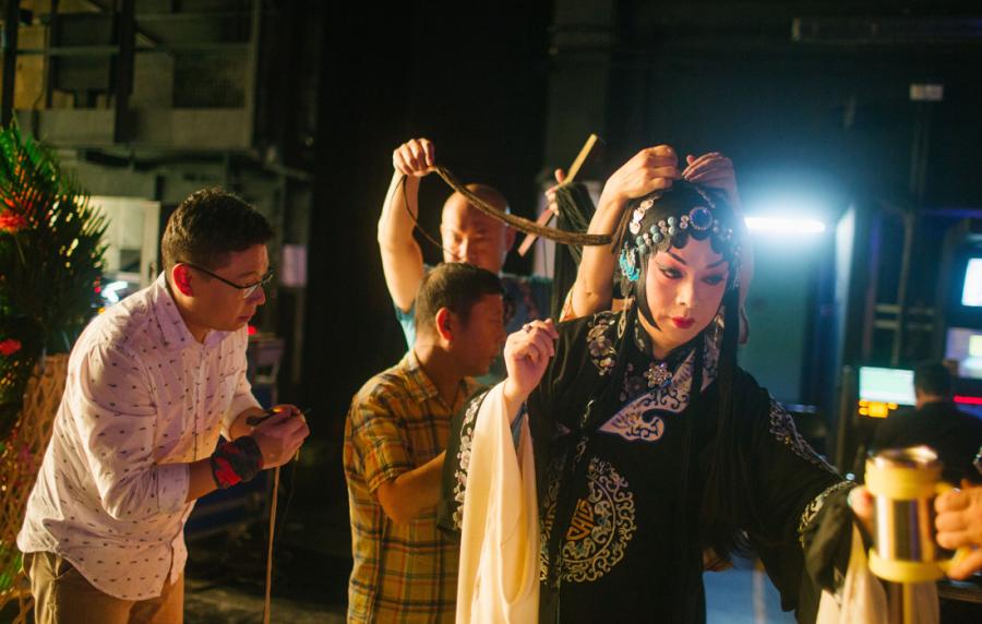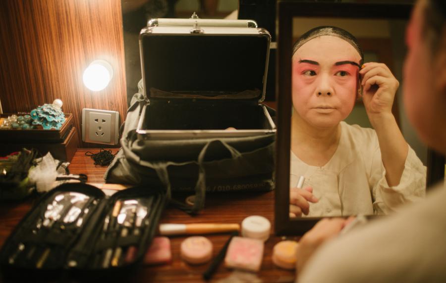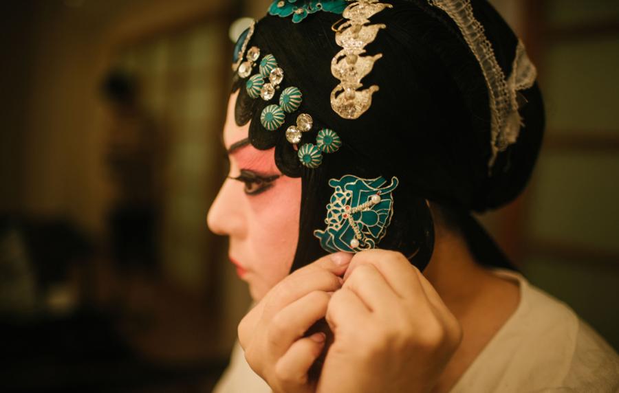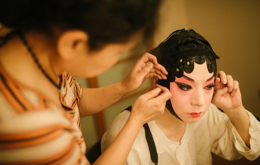 Hu puts on a hairnet before doing his makeup for the traditional Chinese drama Yuzhoufeng at the National Center for the Performing Arts in Beijing on August 13. (Photo: Li Hao/GT)