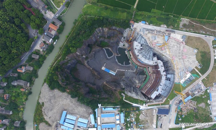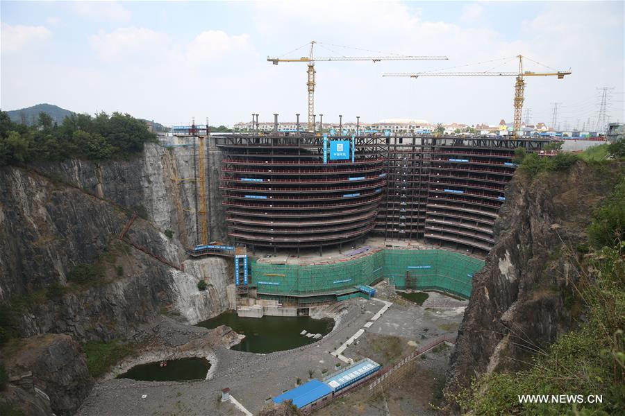 Photo taken on Aug. 16, 2016 shows the construction site of the Shimao quarry hotel in Songjiang District of Shanghai, east China. The five-star hotel is being built in a disused, 90 meter deep quarry. Estimated to be finished in 2017, the hotel will have 370 guest rooms in its two underwater storeys, 17 underground storeys and two above ground storeys. (Photo/Xinhua)