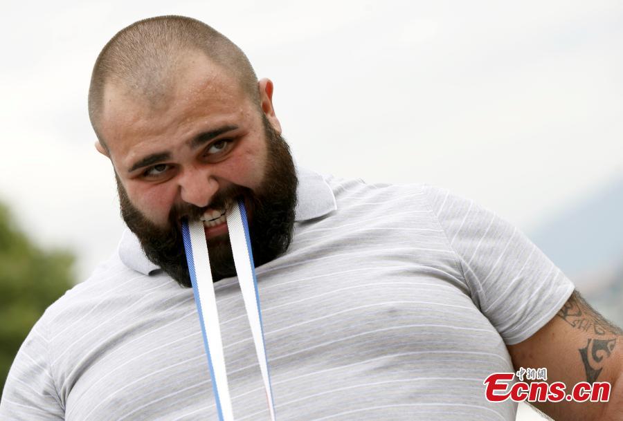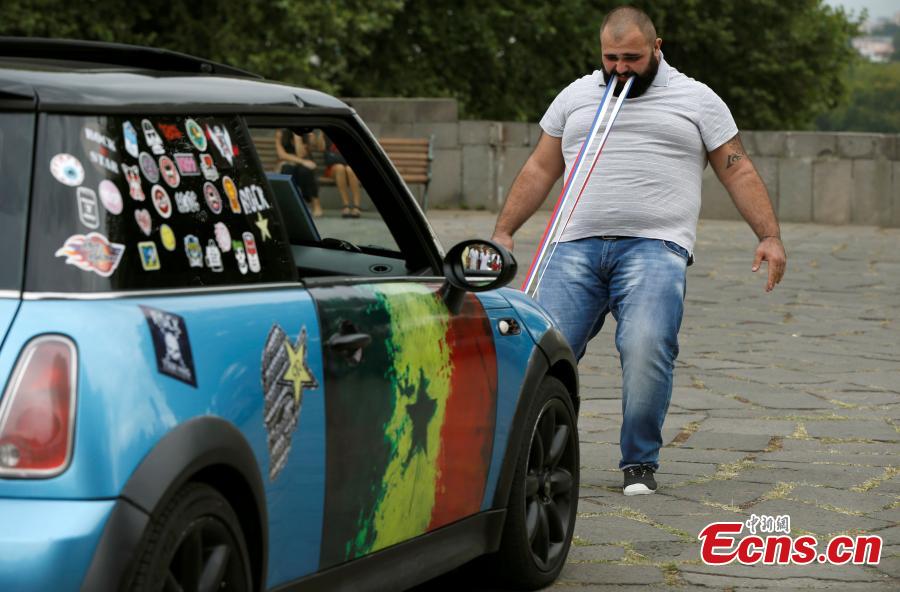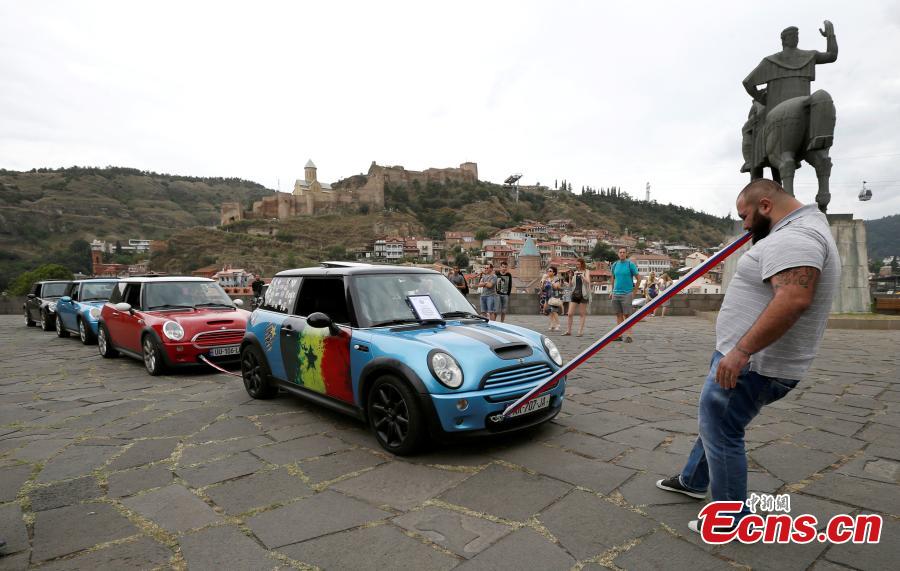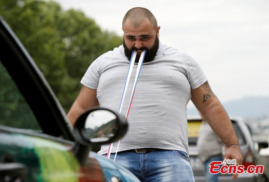 Guram Ustiashvili, 22, pulls four cars with his teeth during an attempt to set a world record in Tbilisi, Georgia, Aug. 16, 2016. (Photo/Agencies)