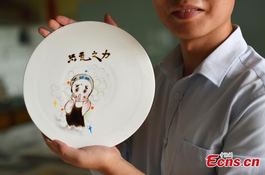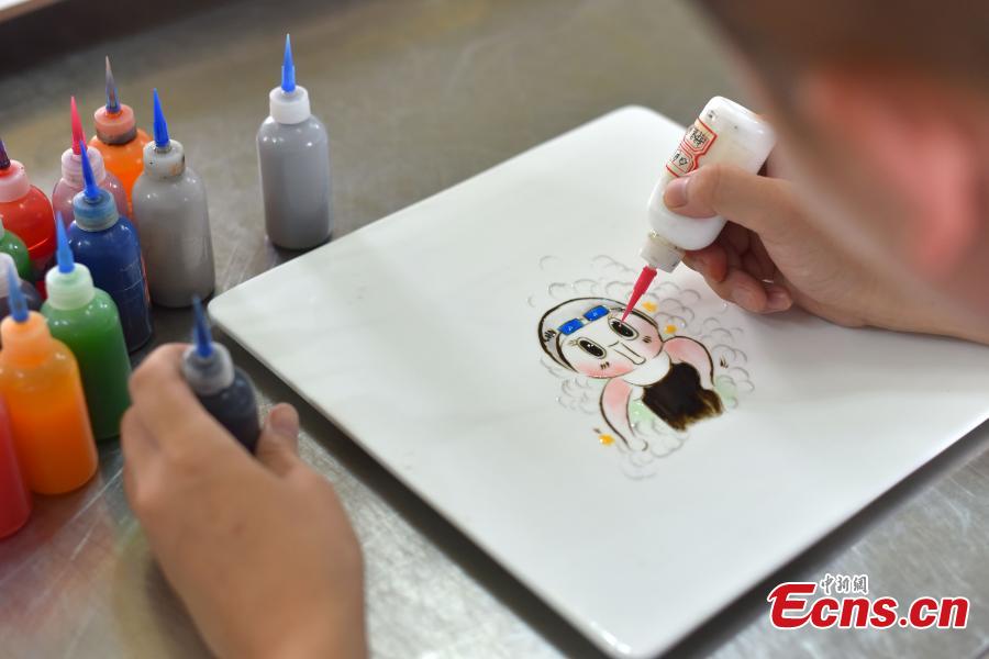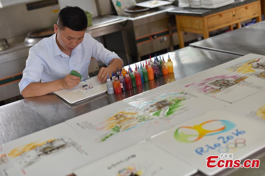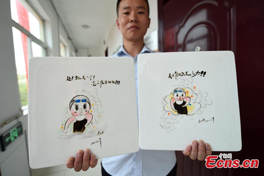 Li Jiayang shows his painting of swimmer Fu Yuanhui made with jam on a plate in Taiyuan City, the capital of North China’s Shanxi Province, Aug. 17, 2016. Fu has become an Internet darling for her winsome facial expressions and joyful over-enthusiasm during the Rio Olympics. (Photo: China News Service/Wu Junjie)