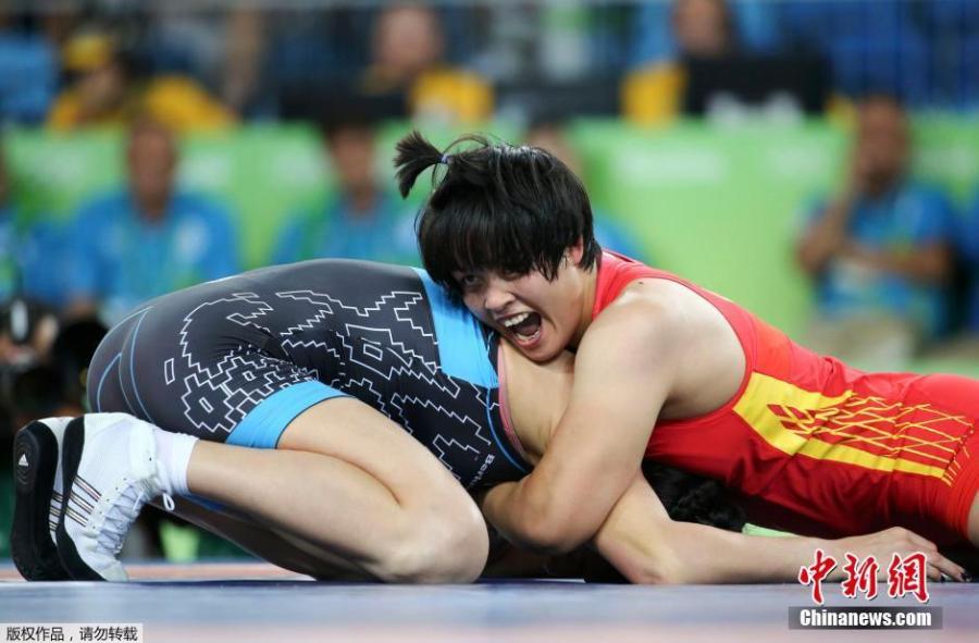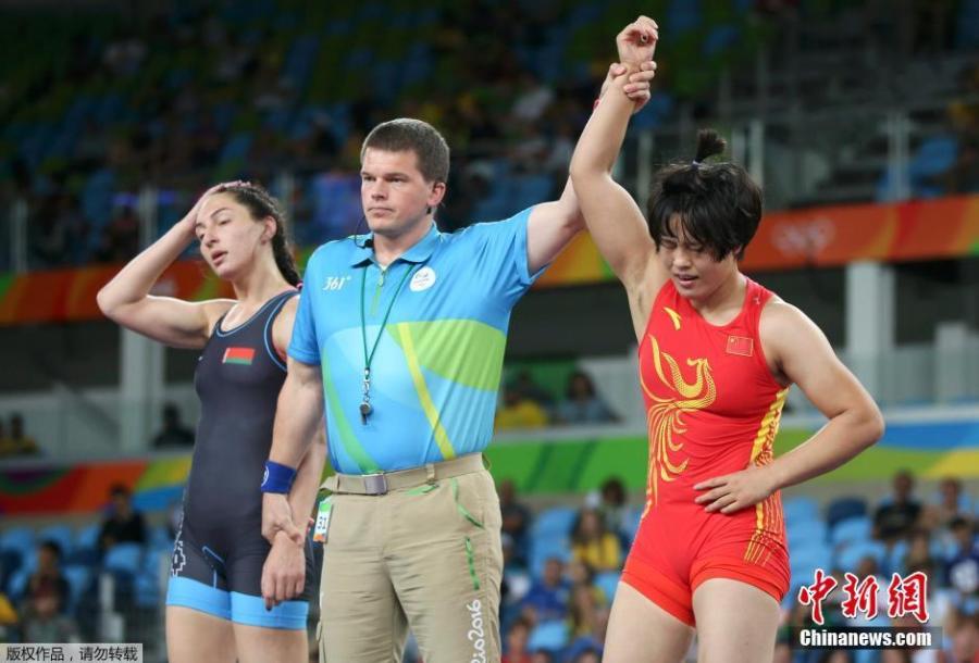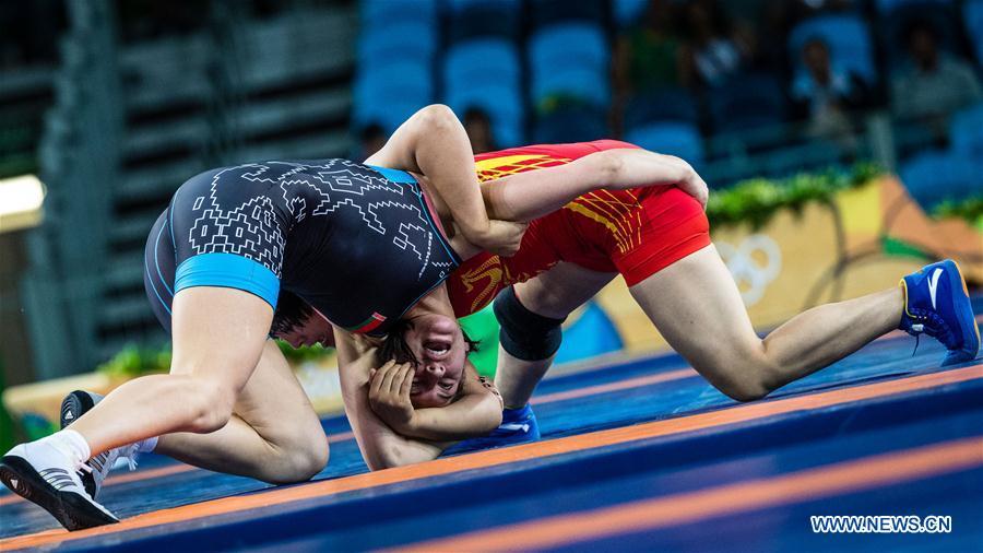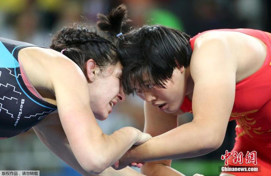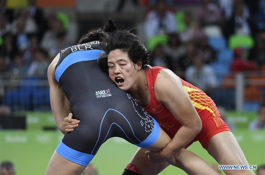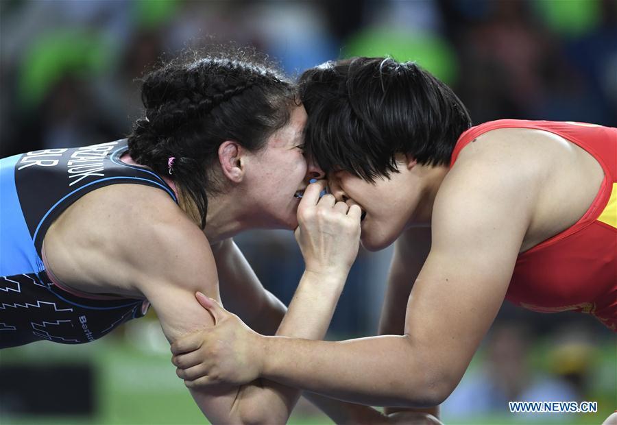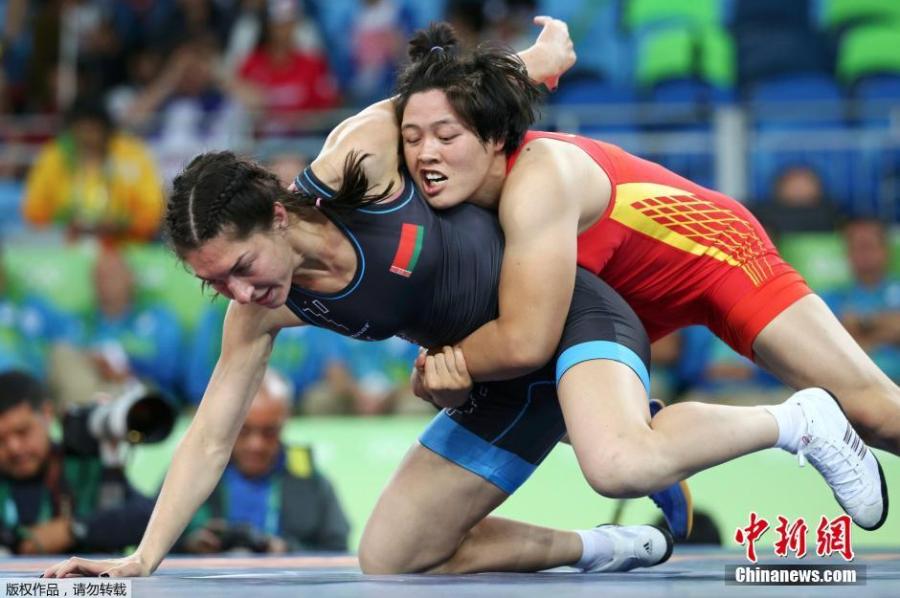 Zhang Fengliu of China (R) defeats Vasilisa Marzaliuk of Belarus during the women's 75-kg freestyle wrestling competition at the 2016 Summer Olympics in Rio de Janeiro, Brazil, Aug. 18, 2016. (Photo/Agencies)