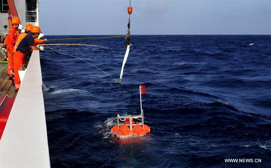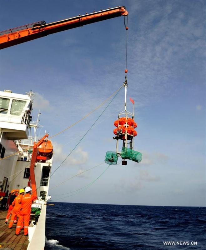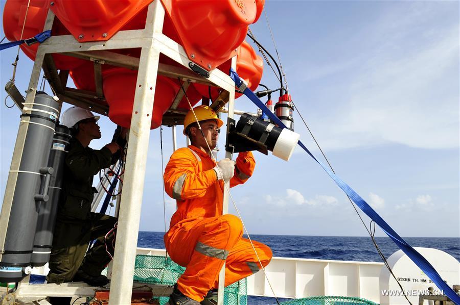 Staff members of Chinese deep-sea explorer ship Zhang Jian prepare "Rainbow Fish," a submersible capable of diving up to 11,000 meters in the sea, in New Britain Trench of the Solomon Sea, Aug. 17, 2016. (Photo:Xinhua/Zhang Jianson)