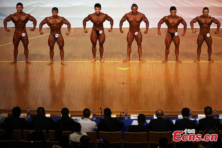 Competitors in a fitness and bodybuilding contest in Nanjing City, the capital of East China’s Jiangsu Province, Aug. 21, 2016. More than 300 participants joined in the provincial contest that includes three events – fitness, bodybuilding, and yoga. (Photo: China News Service/Yang Bo)