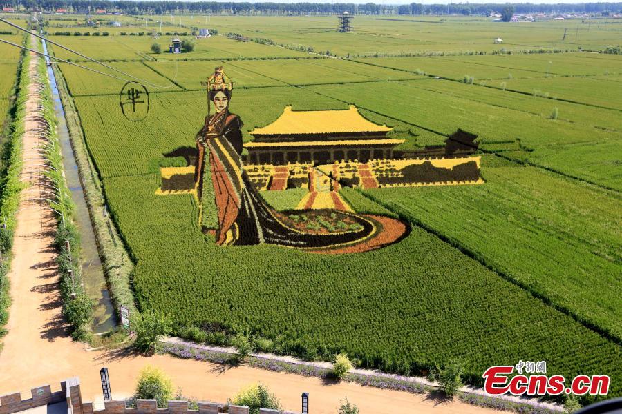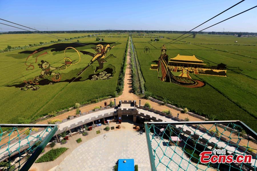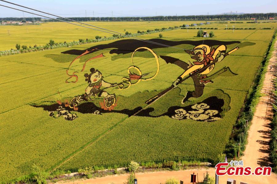 Giant pictures created with rice of various types and colors adorn a paddy field in Shenyang City, the capital of Northeast China’s Liaoning Province, Aug 22, 2016. Using the paddy field as a canvas, the farm has applied 3D technology to make 17 giant pictures, including cartoon characters and hilarious catchphrases, to attract tourists and also boost the income of local farmers. (Photo: China News Service/Liu Baocheng)