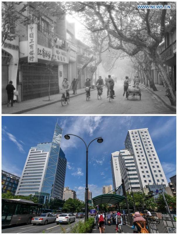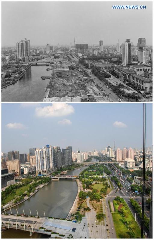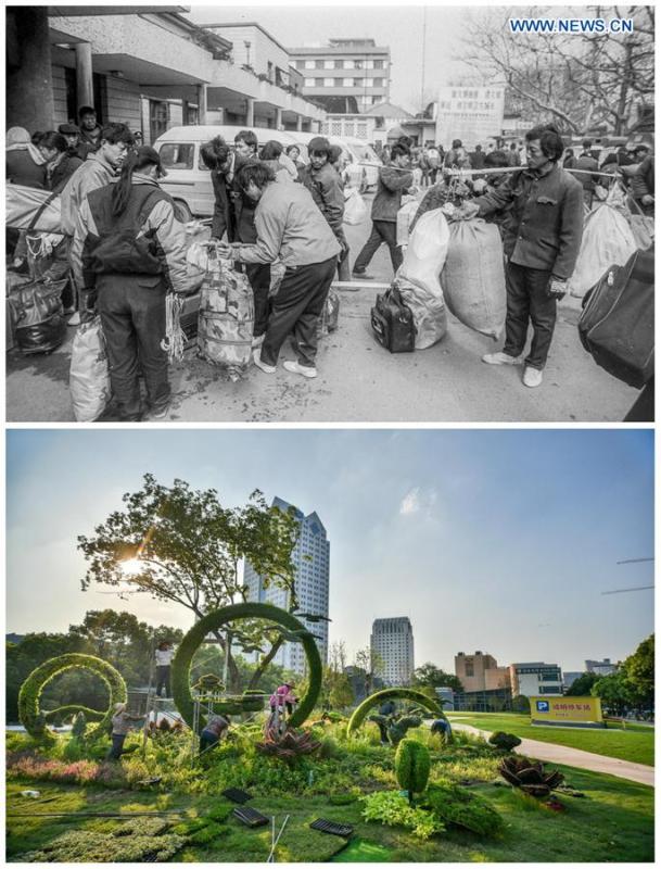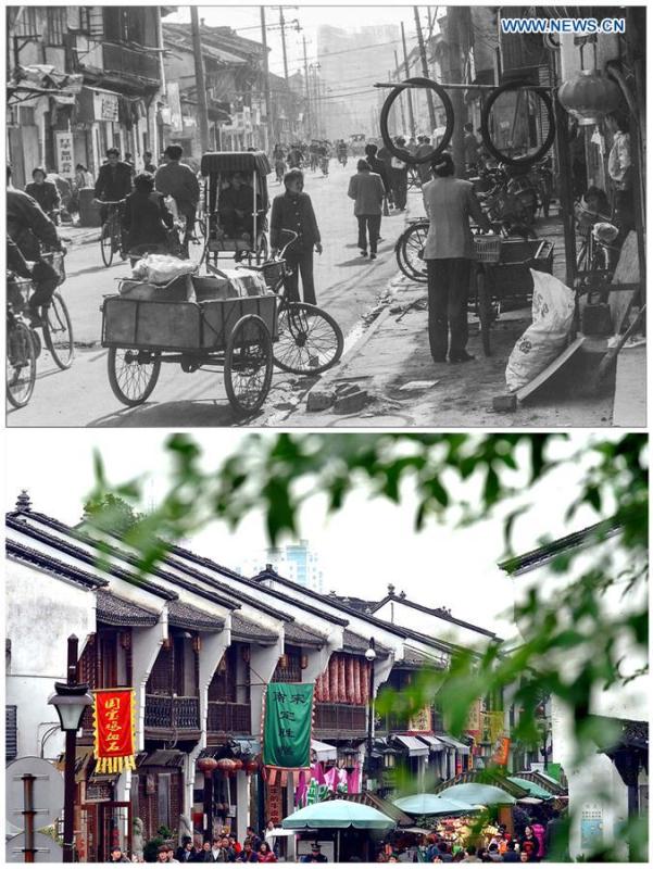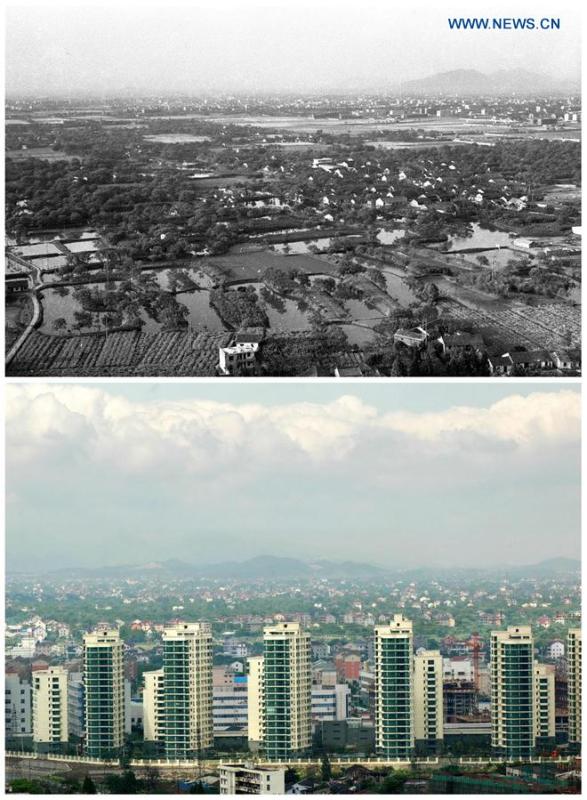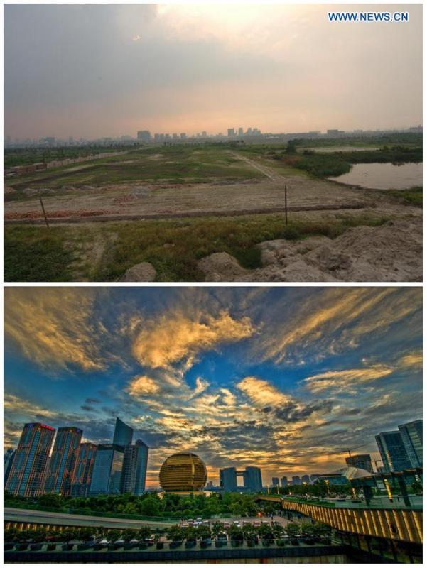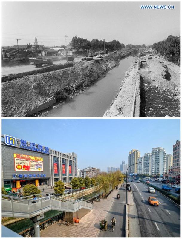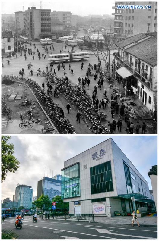 Combined photos taken in 1980 (upper) and in 2016 show the Longxiangqiao area in Hangzhou, capital city of east China's Zhejiang Province. Hangzhou has turned into a modern city with attracting natural sceneries and great improvements in urban construction after years' of development.The G20 Summit will be held there on Sept. 4 to 5. (Photo/Xinhua)