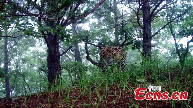 The image of an Amur leopard, also known as Far Eastern leopard, taken by an infrared camera. The forestry department in Heilongjiang Province said no previous record of the leopard is available in China or Russia. With only about 70 adult Amur leopards in the wild today, it is classified as critically endangered by the International Union for Conservation of Nature. (Photo provided to China News Service)