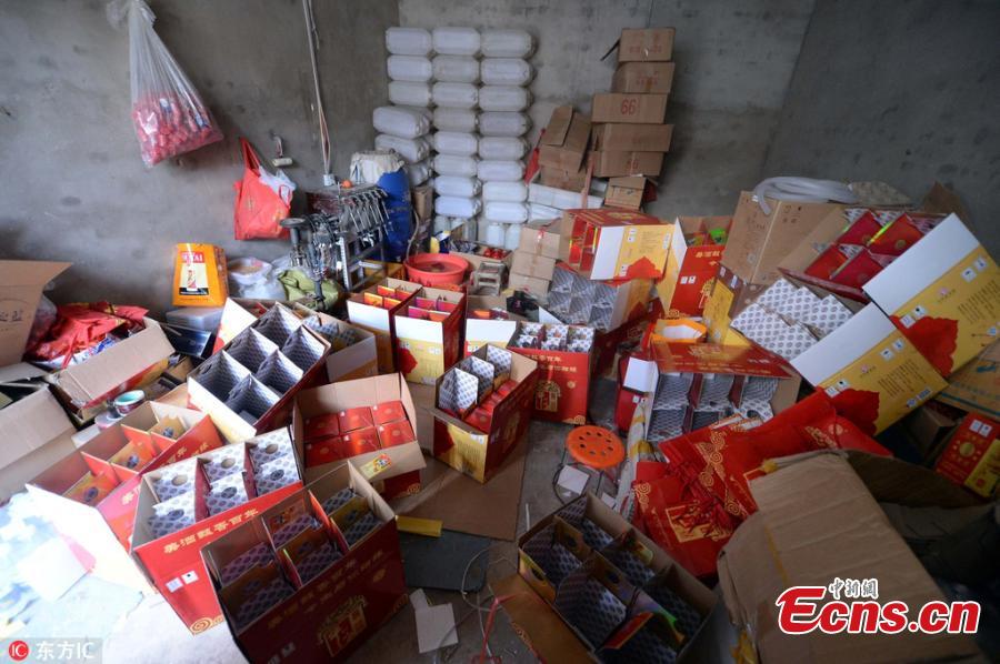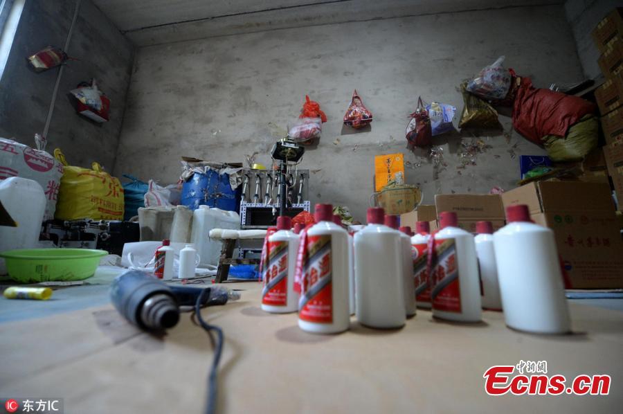 Bottles of fake liquor and those suspected of producing it are seized at a workshop in Daxing District, Beijing, Aug. 23, 2016. Local police caught 20 suspects who used liquor bought in bulk to create bottles of knock-off brands in a 2,000-square-meter workshop hidden in a village. The fake liquor was sold mainly to small and medium-sized restaurants. (Photo/IC)