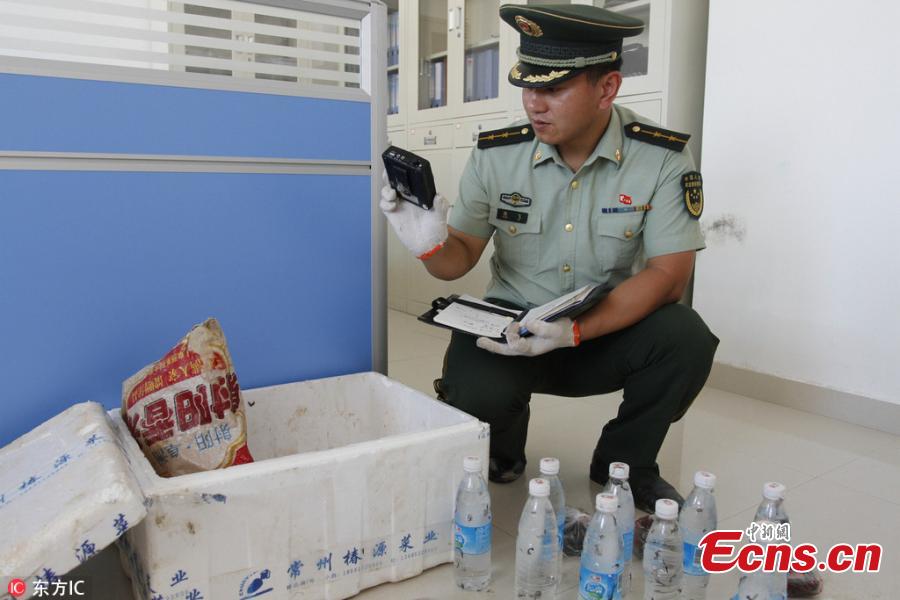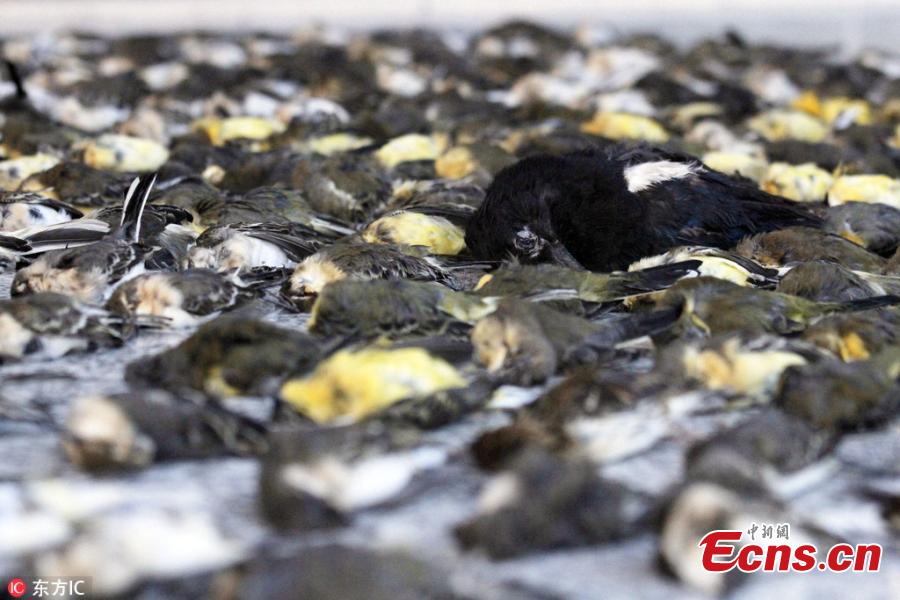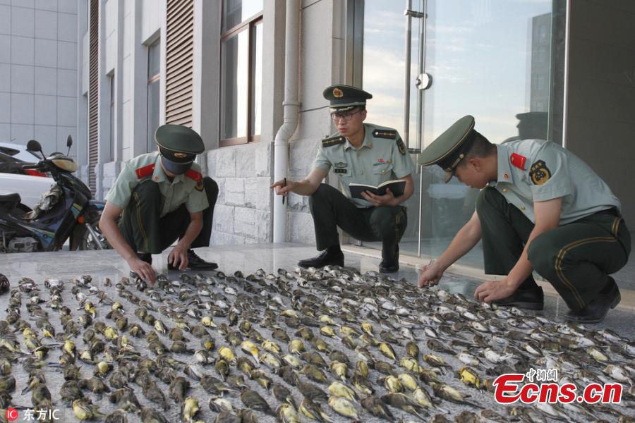 Armed police check dead wild birds discovered on a man’s motorcycle in Yancheng City, East China’s Jiangsu Province, Aug. 23, 2016. The man has been placed under criminal custody after he was found to be carrying 406 dead wild birds that he hunted using insects and a device to broadcast the recorded tweets of birds. (Photo/IC)