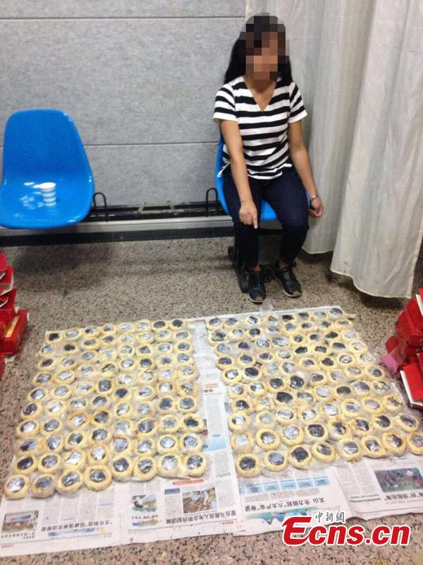 A Myanmar woman sits in a police station in Kunming City, the capital of Southwest China’s Yunnan Province, beside bags of methamphetamine seized from boxes she carried, Aug. 25, 2016. Police said the woman was found with 2,990 grams of methamphetamine hidden in moon cakes on Aug. 15. The 18-year-old said she was paid 7,000 yuan ($1,052) to transport the drugs. Because she is pregnant, she was allowed out on bail. (Photo: China News Service/Zhong Xin)