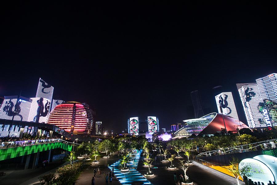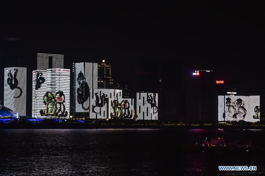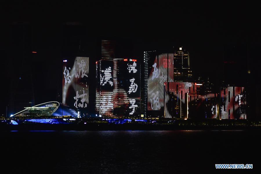Photo taken on Aug. 29, 2016 shows a light show on buildings by the Qiantang River in Hangzhou, capital of east China's Zhejiang Province. The light show is prepared for the 11th G20 summit, which will be held from Sept. 4 to 5 in Hangzhou. (Photo/Xinhua)