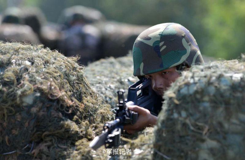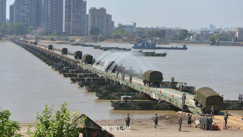 Soldiers steer boats to construct a bridge on the Yangtze River on Aug 29. A 1,150-meter-long 'floating bridge' was created in 26 minutes 40 seconds in a military training. (Photo/81.cn)