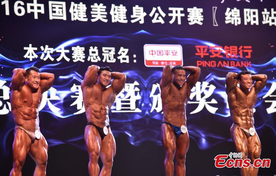 Participants compete in the finals of the 2016 China Fitness and Bodybuilding Open in Mianyang City, Southwest China’s Sichuan Province, Aug. 28, 2016. About 400 participants from China and abroad attended the contest organized by China Bodybuilding Association and a center at the General Administration of Sport. (Photo: China News Service/Yang Yong)