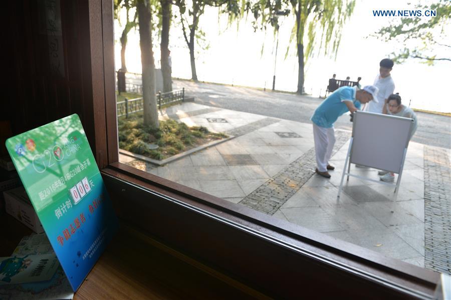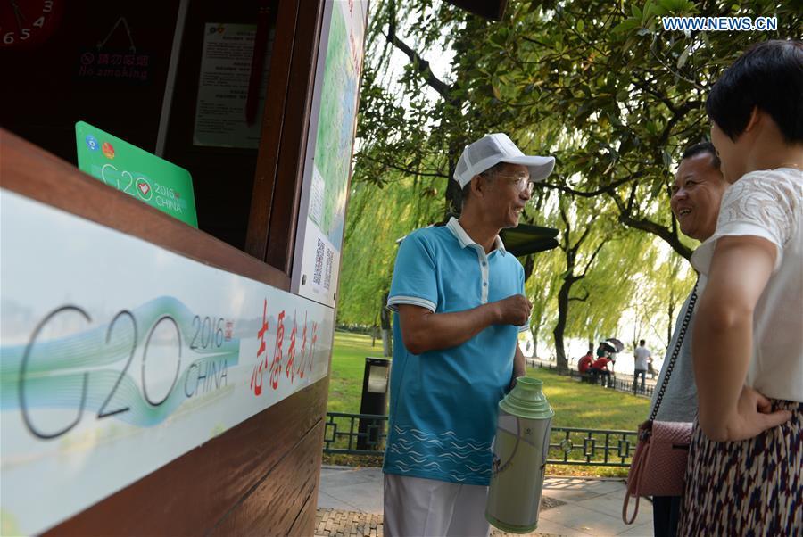 Shi Zhiping (L) gives directions for tourists at the West Lake in Hangzhou, capital of east China's Zhejiang Province, Aug. 29, 2016. Shi, 64, has been a volunteer at the West Lake since his retirement in 2012. He received professional trainings on etiquette, foreign languages and emergency medical aid before the G20 summit, to be held in Hangzhou on Sept. 4-5. There are 1.56 million registered volunteers in Hangzhou. (Xinhua/Yin Dongxun)