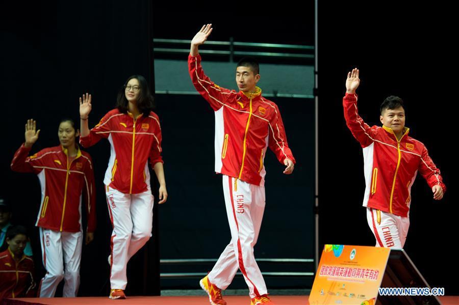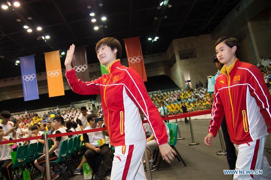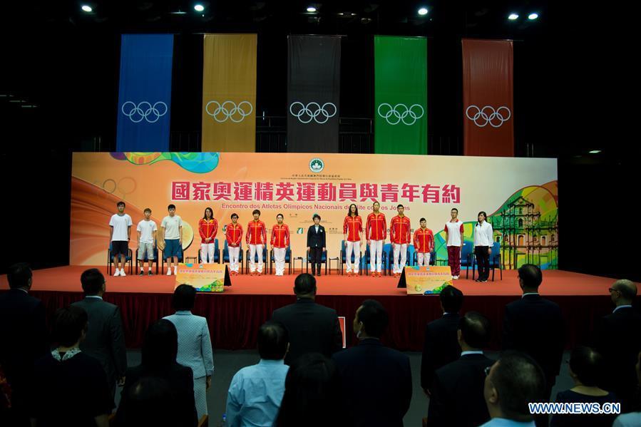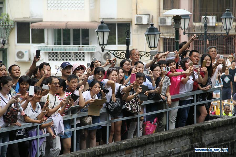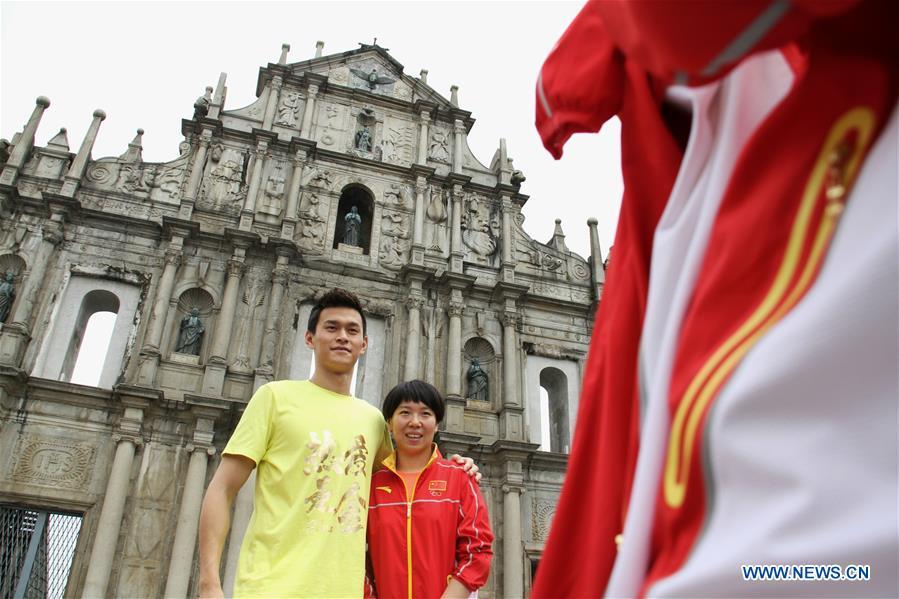 Head coach of Chinese women's volleyball team Lang Ping (1st L) and her team members visit the Ruins of St. Paul's in Macao, south China, Aug. 30, 2016. Delegation of Chinese mainland Olympians arrived in Macao Monday afternoon, embarking a four-day visit here. (Xinhua/Wang Shen)