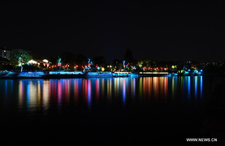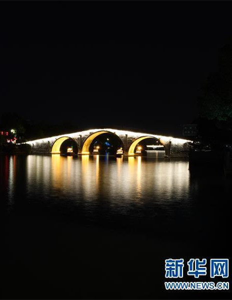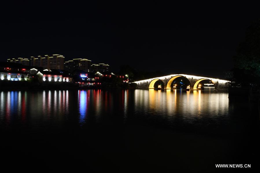 Photo taken on Aug. 30, 2016 shows the night view of Gongchen Bridge stretching over Jinghang Canal, or the Great Canal in Hangzhou, capital of east China's Zhejiang Province. The G20 Summit will be held in Hangzhou on Sept. 4 to 5. (Xinhua/Chen Yehua)