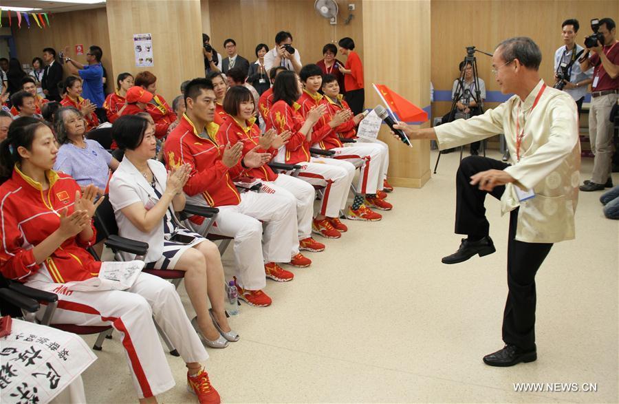 Chinese swimmer Sun Yang (L front) shakes hands with an elderly man at a day care center for senior citizens in Macao, south China, Aug. 31, 2016. Delegation of Chinese mainland Olympians arrived in Macao Monday afternoon, embarking a four-day visit here. (Photo/Xinhua)