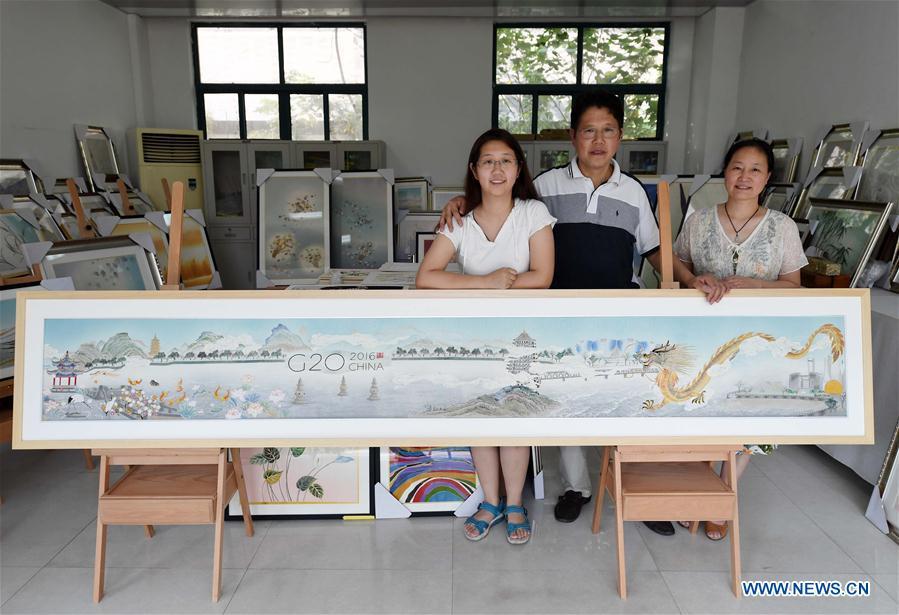 Ye Jianming introduces his silk scroll work in Hangzhou, capital of east China's Zhejiang Province, Aug. 31, 2016. Ye, a local intangible cultural heritage inheritor, made the 3.08-meter-long, 0.56-meter-wide silk scroll with his wife and daughter to greet the G20 summit in Hangzhou. (Xinhua/Chen Yehua)