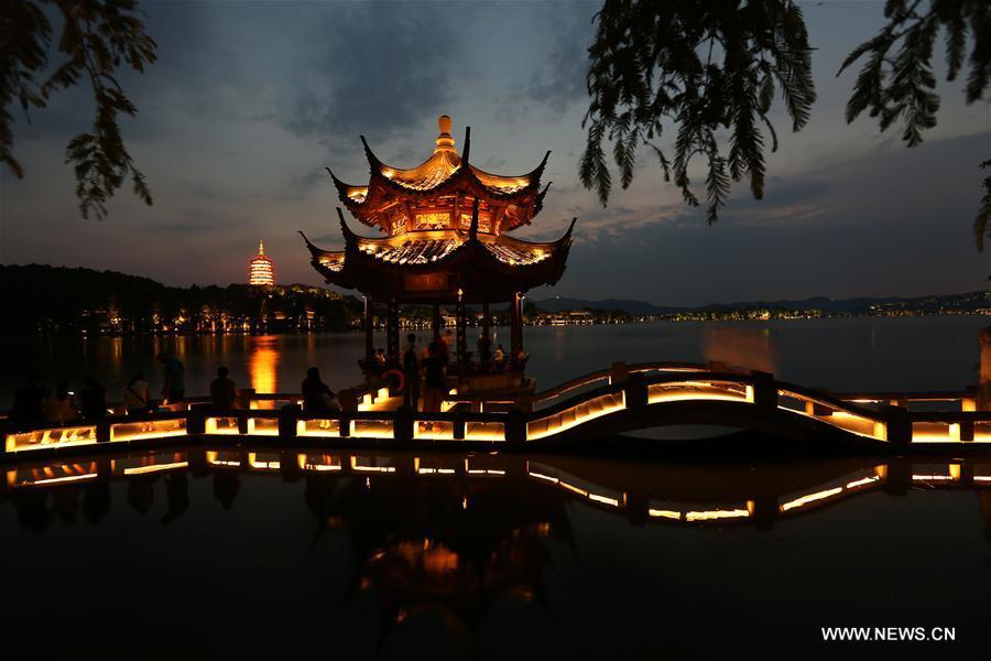 Photo taken on Aug. 30, 2016 shows a night view of the West Lake in Hangzhou, capital city of east China's Zhejiang Province. The G20 Summit will be held in Hangzhou from Sept. 4 to 5. (Xinhua/Jin Liangkuai)