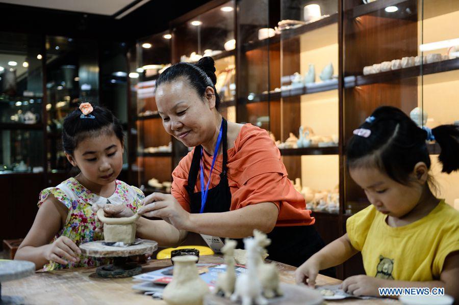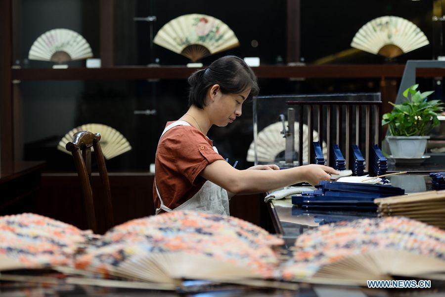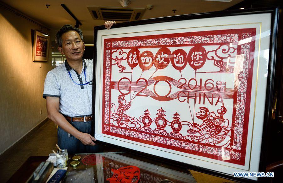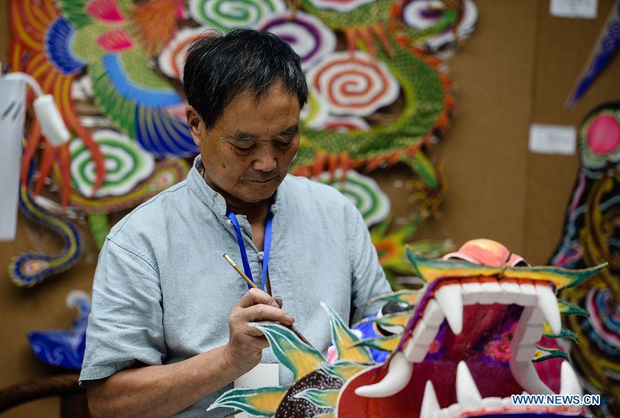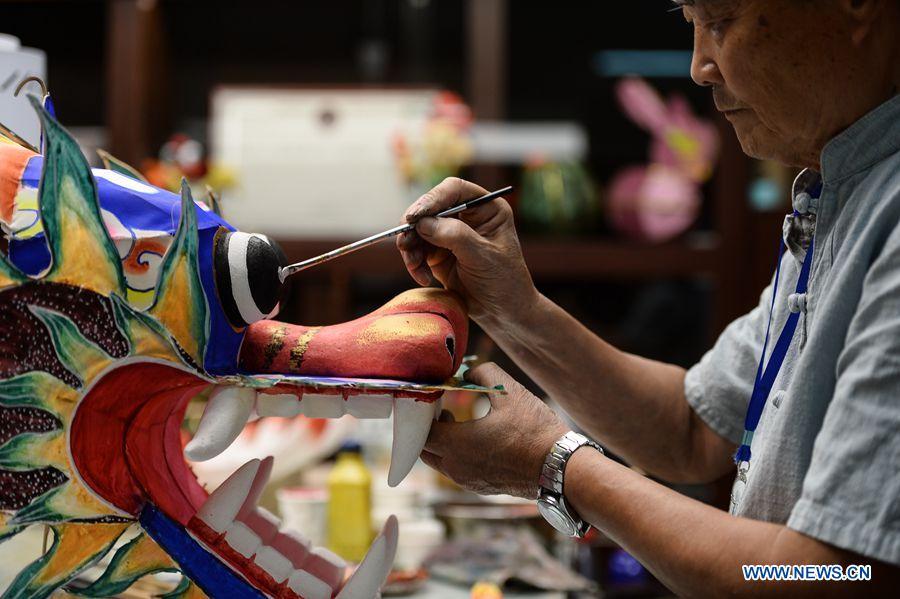 Folk artist Cheng Dishen paints the eye of a dragon-shaped kite at the Hangzhou Artsand Crafts Museum in Hangzhou, capital city of east China's Zhejiang Province, Sept.1, 2016. Traditional handicrafts and local intangible cultural heritages were demonstrated in the museum.(Xinhua/Li Xiang)