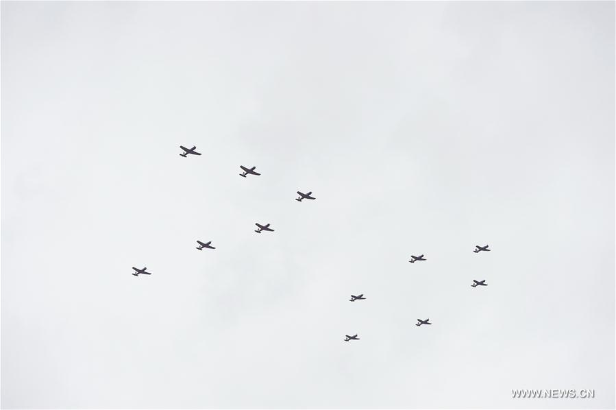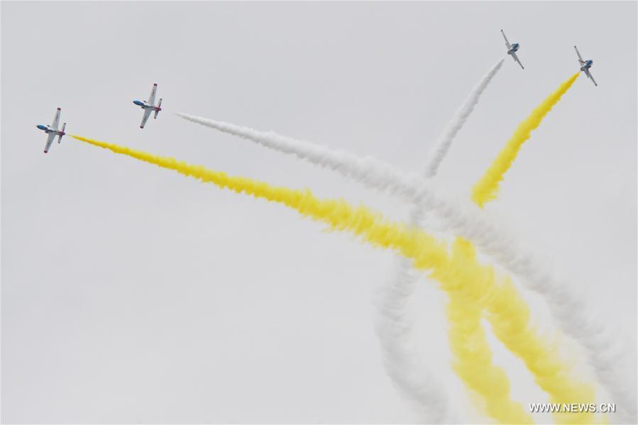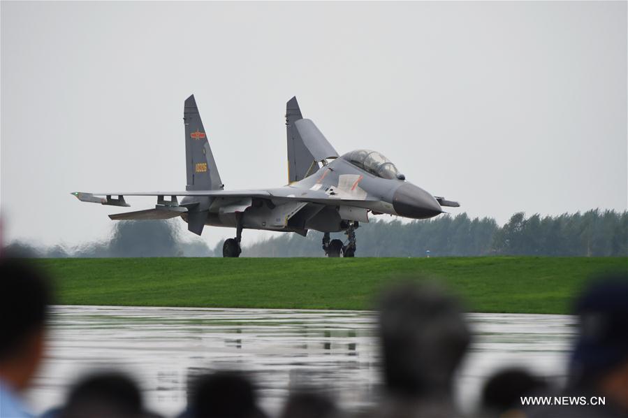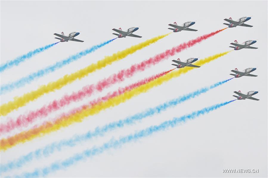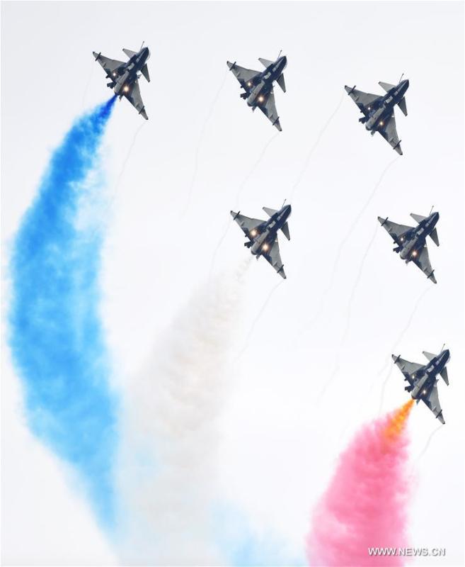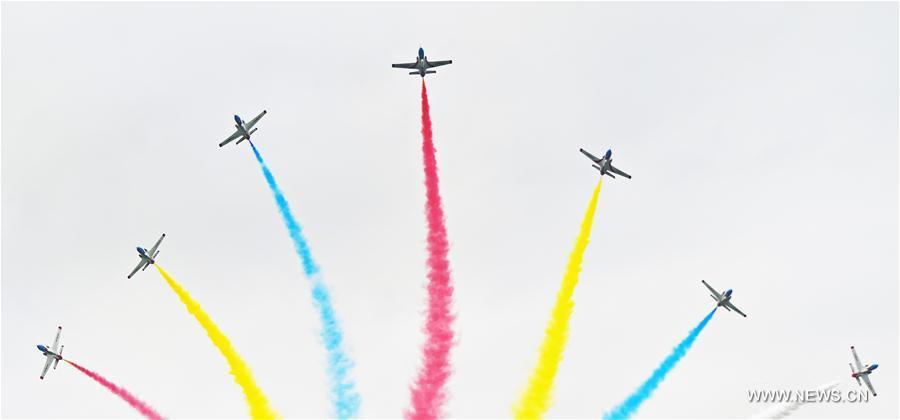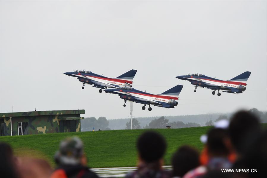 The Red Falcon Air Demonstration Team performs in the sky during the PLA Air Force Aviation Open Day in Changchun, capital city of northeast China's Jilin Province, Sept. 2, 2016. The open day aims to demonstrate the achievements of Chinese People's Liberation Army (PLA) air force and enhance the public awareness of aerospace safety. Some equipments of the PLA air force will be open to the public for the first time. (Xinhua/Zhang Nan)