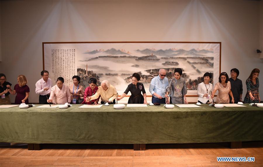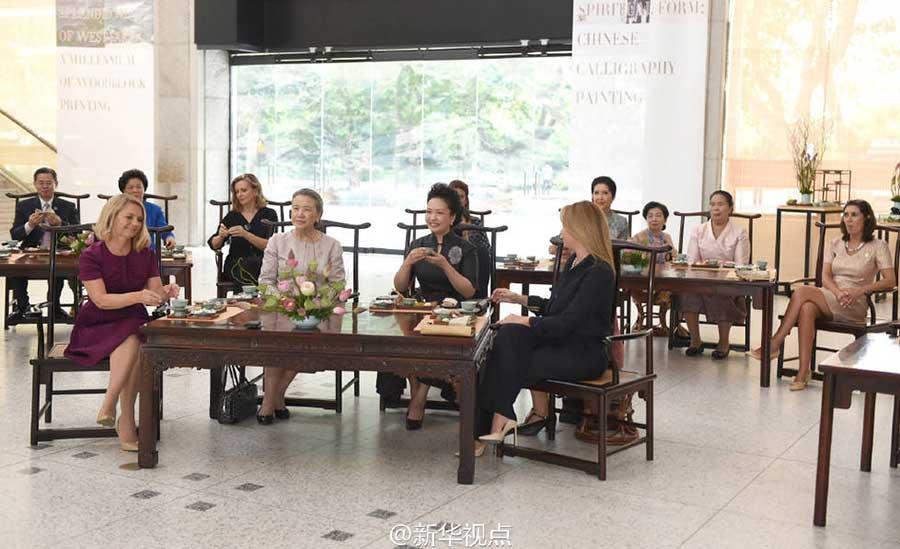 Chinese President Xi Jinping's wife Peng Liyuan and spouses of leaders attending G20 summit write calligraphy during a visit to China Academy of Art in Hangzhou, capital of east China's Zhejiang Province, Sept. 5, 2016. (Photo/Xinhua)