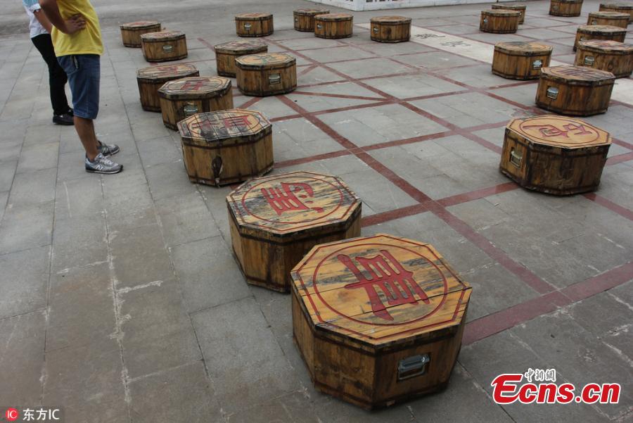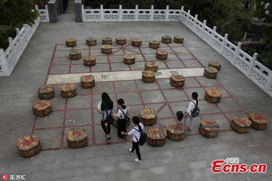 Students walk past giant Xiangqi (Chinese chess) pieces on the ground at Wuhan Bioengineering Institute in Wuhan City, the capital of Central China’s Hubei Province, Sept. 4, 2016. The school offers a series of innovative sports courses, including the giant Chinese chess pieces, for students to move and compete as a way of exercising mental and physical capabilities. Each piece measures 60 centimeters in diameter, 30 centimeters tall, and weighs 60 kilograms. The board game represents a battle between two armies, with the object to capture the enemy's king. (Photo/IC)