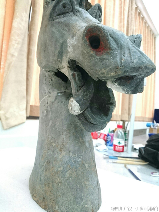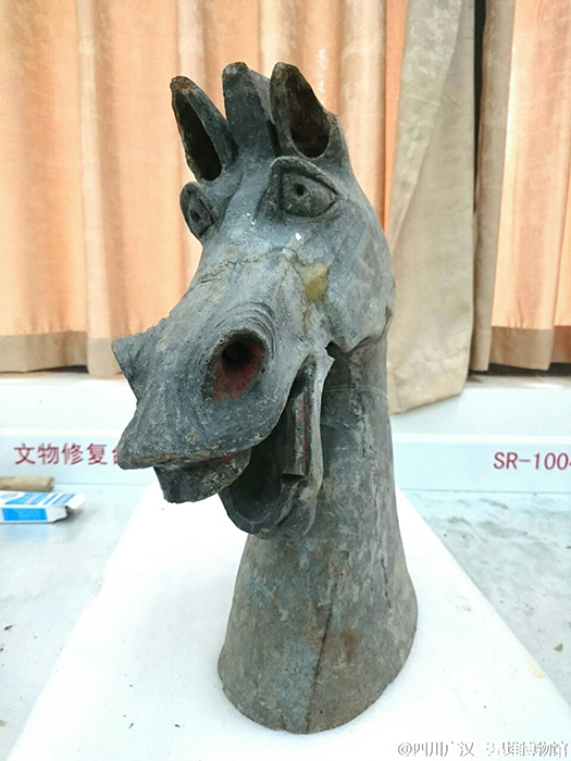 A horsehead-shaped statue is on display after having undergone repairs in Sanxingdui Museum in Guanghan City, Southwest China’s Sichuan Province. The site of Sanxingdui is recognized as one of the most important ancient remains in the world for its vast size, lengthy period and enriched cultural contents. The pictures of the relic have gone viral on the Internet because of the horse’s apparent interesting looks. (Photo/Weibo of Sanxingdui Museum)