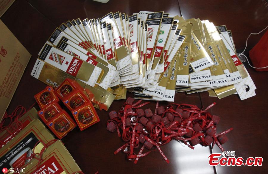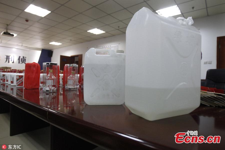 A policeman checks Moutai at a restaurant in Zhengzhou, capital of Central China’s Henan Province. Police in Zhengzhou have arrested 21 suspects, including 14 waiters at a local restaurant, for substituting their customers' genuine Moutai liquor with counterfeit versions. According to Wang, a waiter at the restaurant, the stolen Moutai was resold for 450 yuan a bottle.Local police said 14 of the restaurant's 15 waiters were involved in the case, while the famed distilled Chinese liquor was worth approximately 650,000 yuan ($97,224). (Photo/IC)