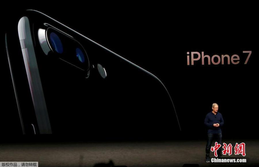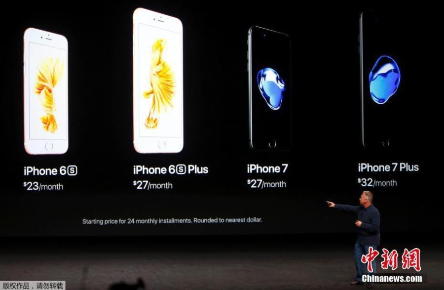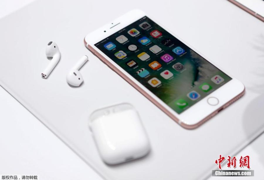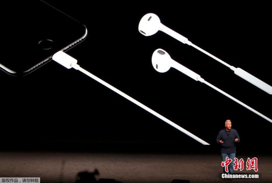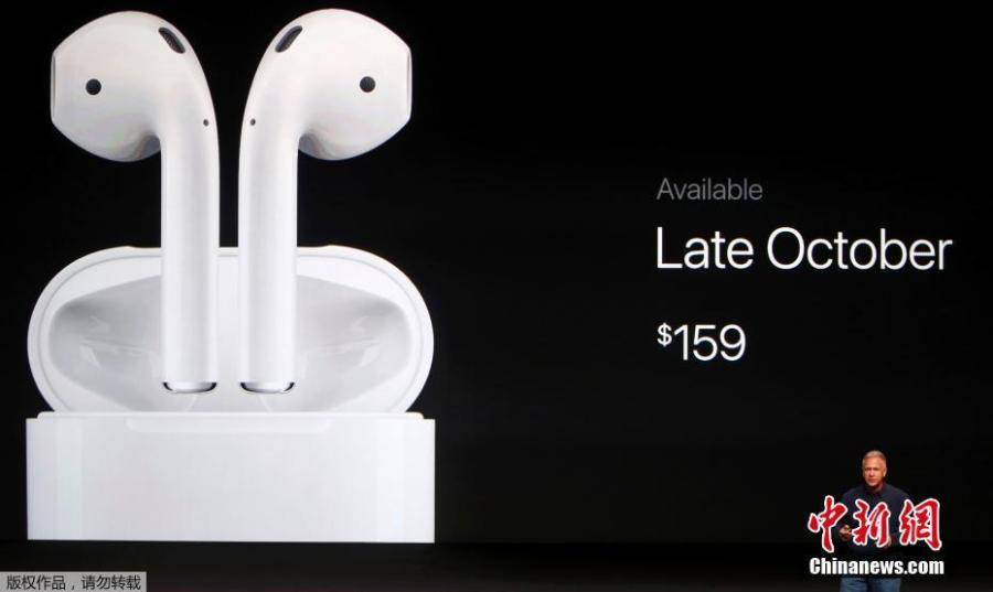 Apple Senior Vice President of Worldwide Marketing Phil Schiller speaks during the Apple launch event in San Francisco, Sept. 7, 2016. Apple also is introducing AirPods, new wireless earbuds that will be sold separately for $159, which lets users access Siri with a double-tap. The iPhone 7 starts at $649 — the same as the iPhone 6s, but doubling the amount of storage, from 16 gigabytes to 32 GB. The iPhone 7 Plus starts at $769 with 32 GB. (Photo/Agencies)