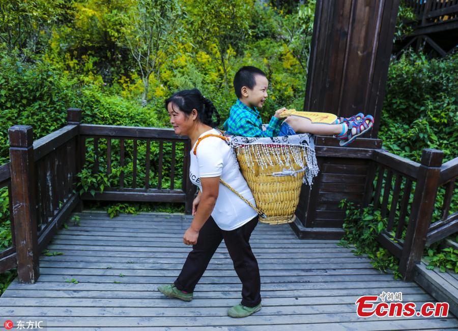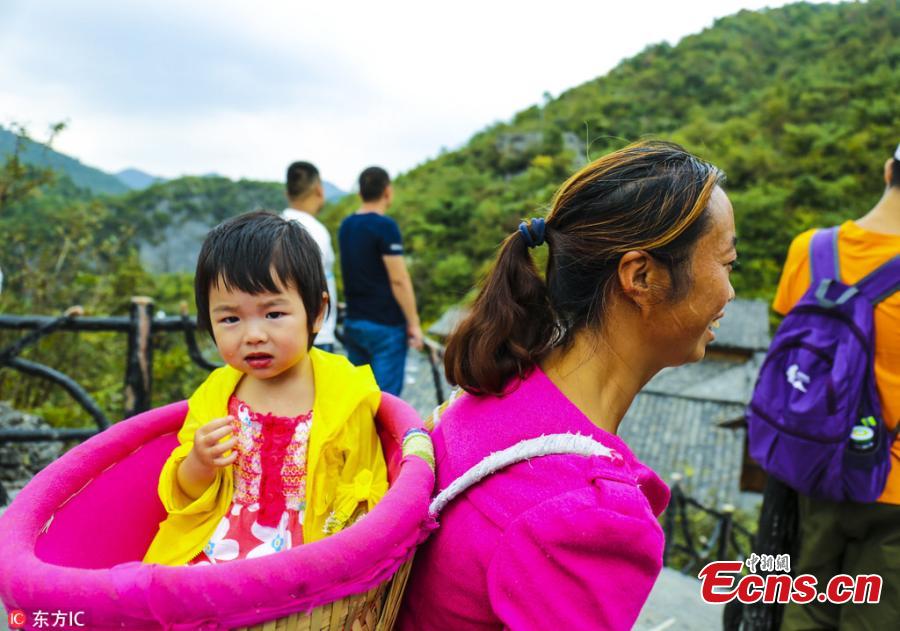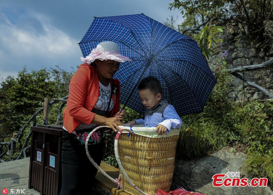 A woman carries a child in a basket on her back at the Grand Canyon in Enshi Tujia and Miao Autonomous Prefecture, Central China’s Hubei Province, Sept. 10, 2016. Local residents usually charge 80 yuan ($12) to carry one child traveller to climb over steep roads on one mountain, or 320 yuan for the 8.5-kilometer-long road across four mountains. Thirty women and four men do the job in the scenic area during the peak tourist season. (Photo/IC)
