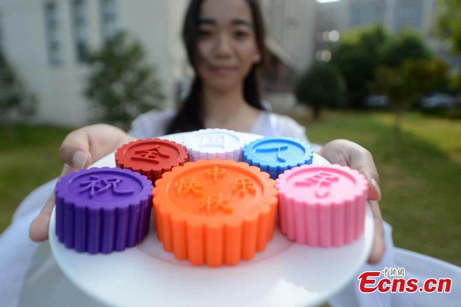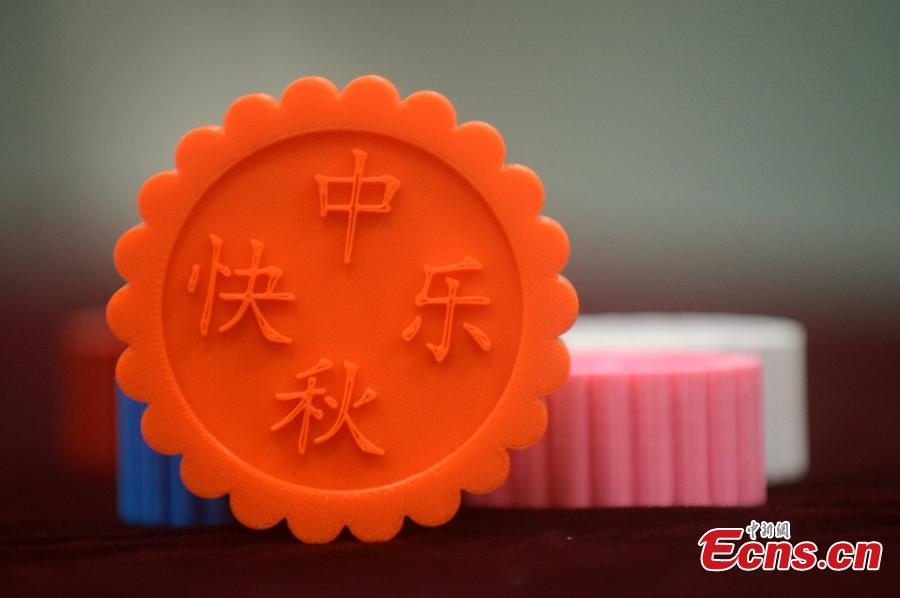 Mooncake models made with 3D printing technology in Yangzhou University in Yangzhou City, East China’s Jiangsu Province, Sept. 12, 2016. The mooncake is a must-have delicacy for Mid-Autumn Festival, which falls on Sept. 15 this year. (Photo: China News Service/Meng Delong)
