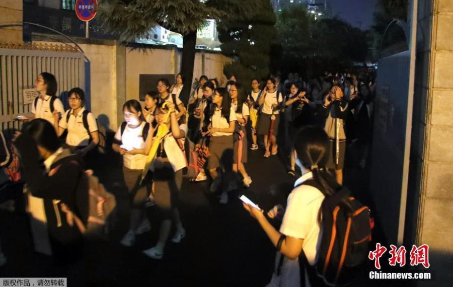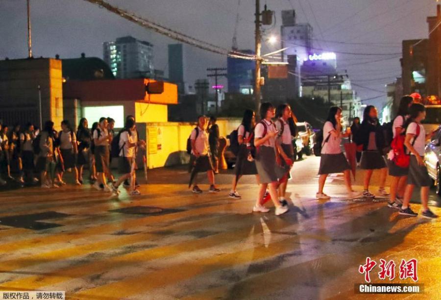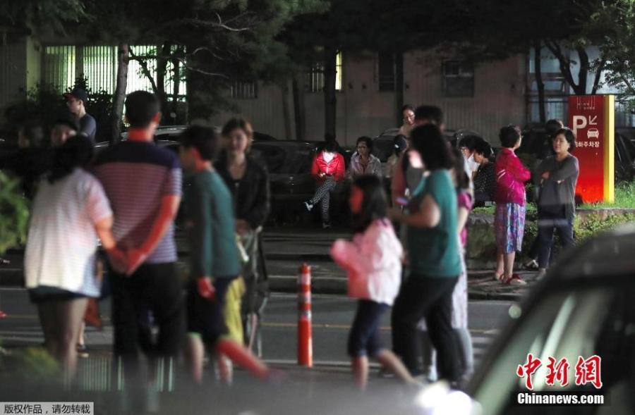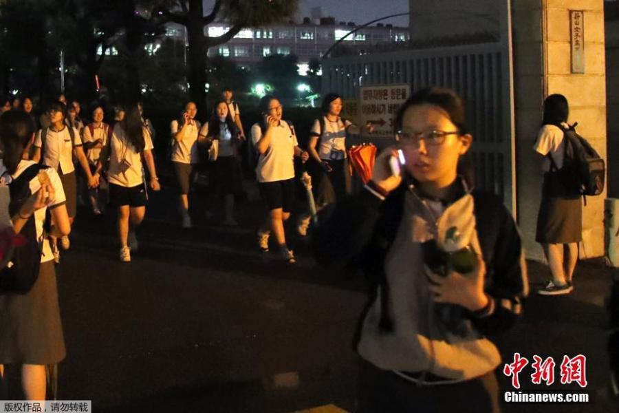 Students leave their school after an earthquake in Ulsan, South Korea, Sept. 12, 2016. The Korea Meteorological Administration said two quakes measured magnitude 5.1 and 5.8 and were centered near Gyeongju city. It said the magnitude-5.8 quake was the largest ever recorded in South Korea. (Photo/Agencies)