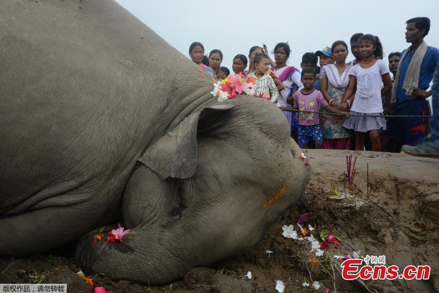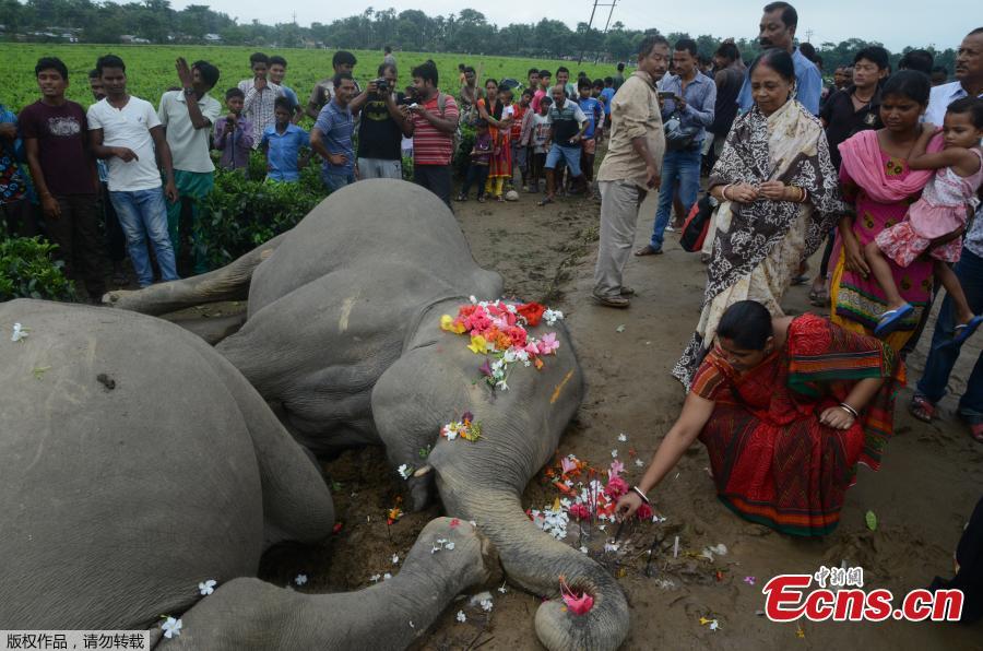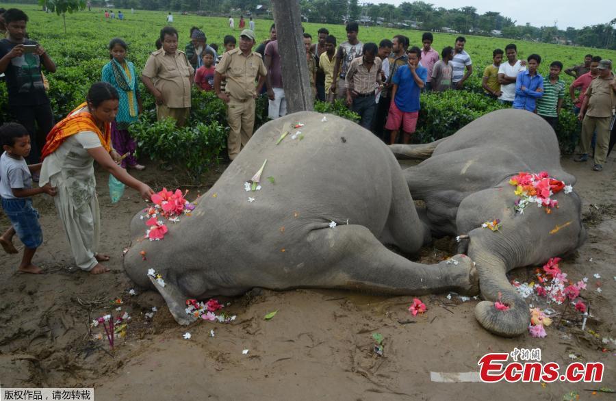 An Indian villager puts flowers on the body of a female elephants after they were electrocuted next to an electricity pole at Kiranchandra Tea Garden, on the outskirts of Siliguri, on September 10, 2016. Two female elephants were found near a electricity pole where they seem to have been electrocuted, a forest official said.(Photo/Agencies)