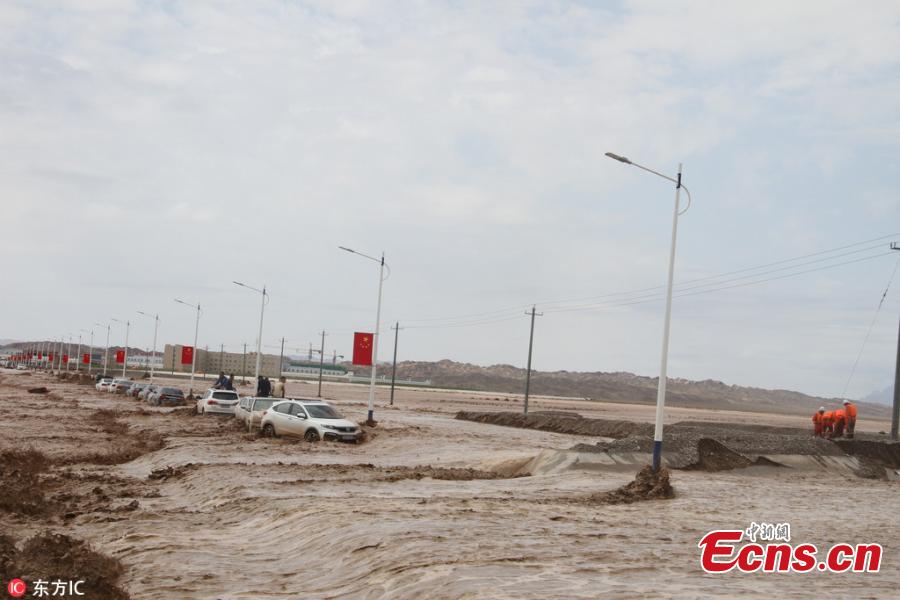 Rescuers assist people affected by torrential flooding in Kizilsu Kirghiz Autonomous Prefecture, Northwest China’s Xinjiang Uygur Autonomous Region, Sept. 13, 2016. Thirteen people were evacuated to safe place after their cars were stranded in rising floodwater. (Photo/IC)