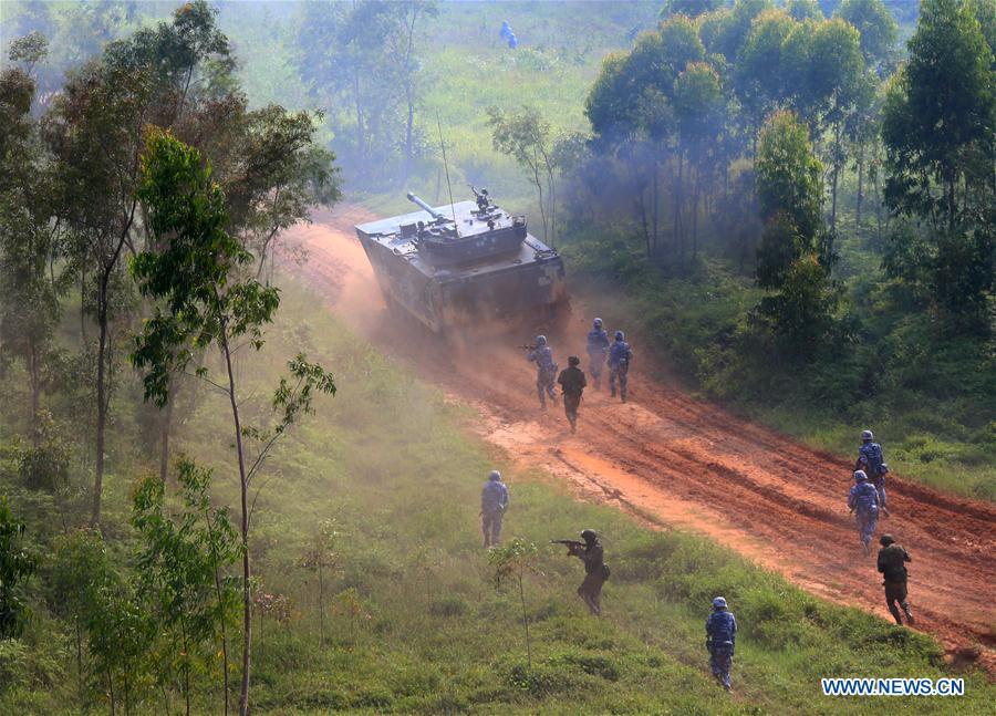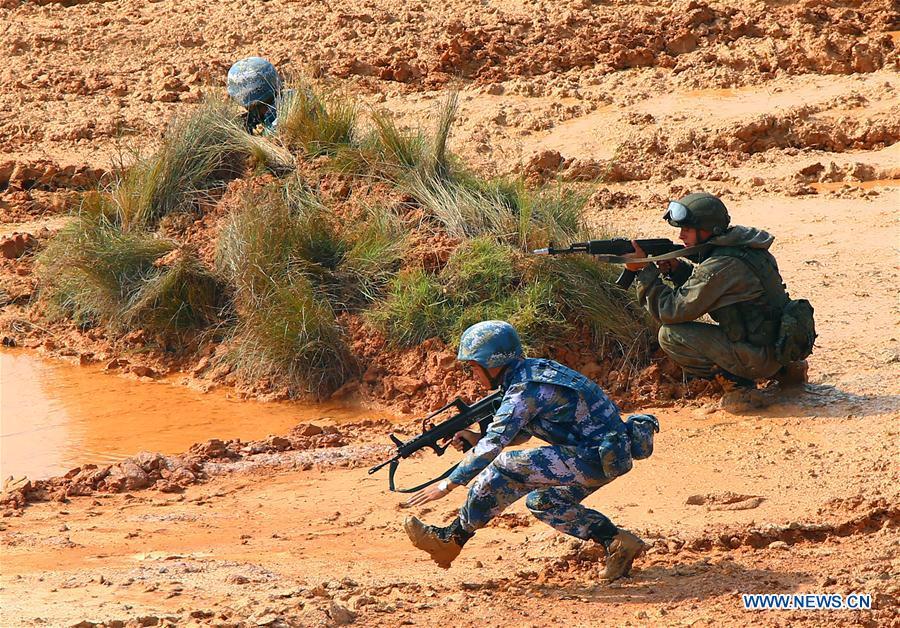 Chinese and Russian marines hug during a joint naval drill in Zhanjiang, south China's Guangdong Province, Sept. 14, 2016. China and Russia started "Joint Sea 2016" drill off Guangdong Province in the South China Sea on Tuesday. The drill will run until Sept. 19, featuring navy surface ships, submarines, fixed-wing aircraft, helicopters, marines and amphibious armored equipment. (Xinhua/Zha Chunming)