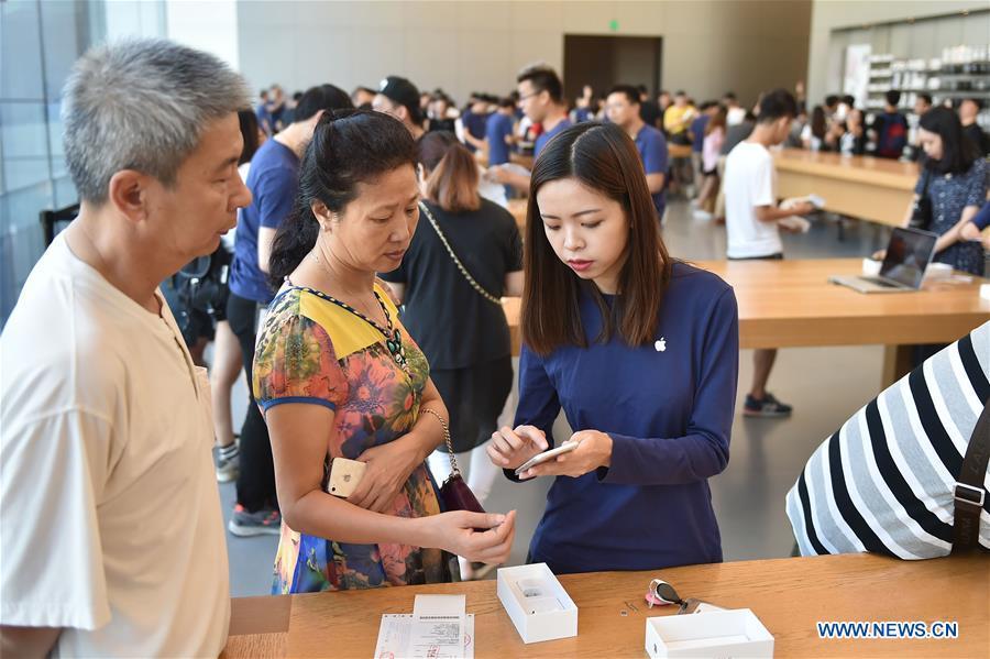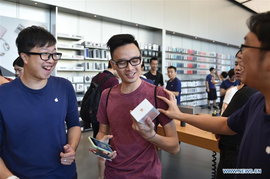A customer receives his iPhone 7 at an Apple store in Guangzhou, capital of south China's Guangdong Province, Sept. 16, 2016. The iPhone 7 and iPhone 7 Plus were released in China on Friday. (Photo/Xinhua)