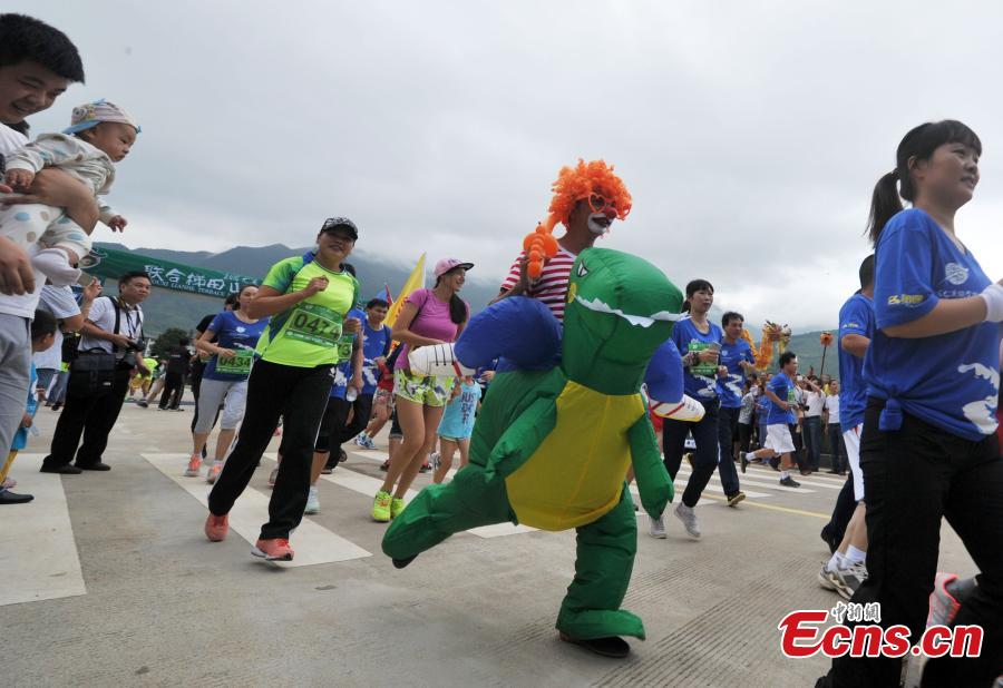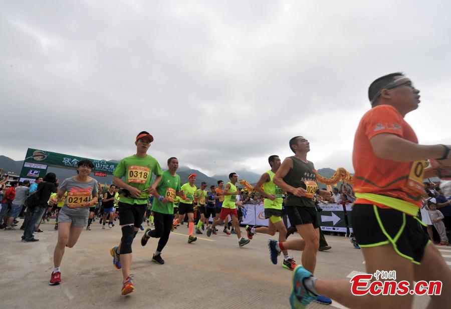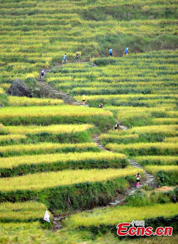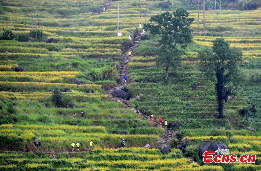 Participants run in a marathon held on terraced fields in Lianhe Township, Youxi County, East China’s Fujian Province, Sept. 17, 2016. Over 300 runners from home and abroad competed in the race. The terraced fields, original built in the Tang Dynasty (618-907), stretch 10,717 mu (714 hectares) in eight villages, and become known as "the most beautiful terrace in China.” (Photo: China News Service/Zhang Bin)