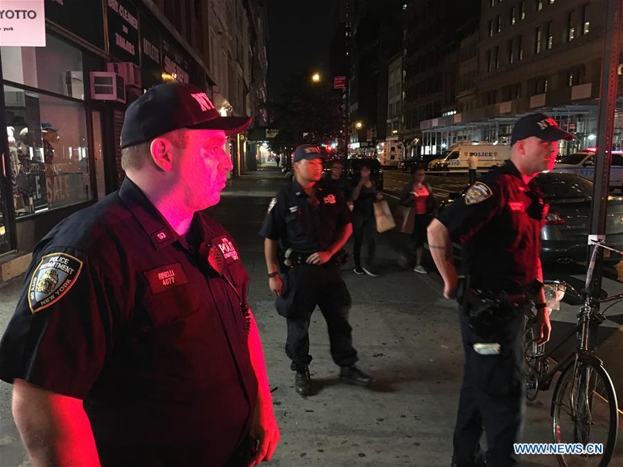 The cellphone photo taken on Sept. 17, 2016 shows policemen on duty near the site of an explosion in New York, the United States. A total of 29 people have been injured in an explosion in the Chelsea neighborhood of Manhattan on Saturday evening, and the cause of the blast is under investigation, the New York City Fire Department said. (Photo/Xinhua)