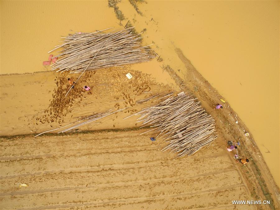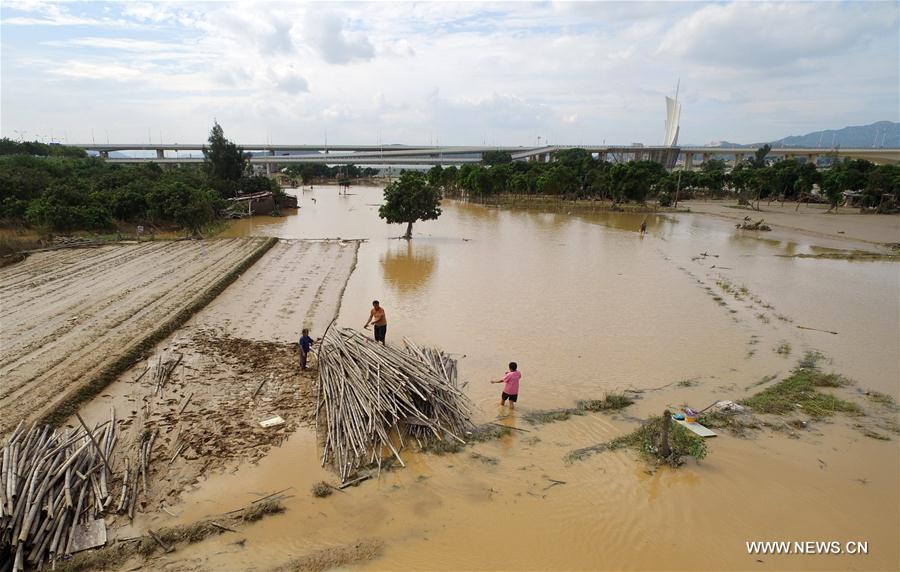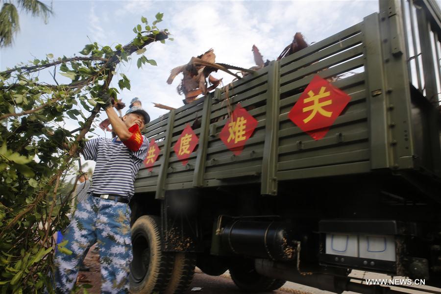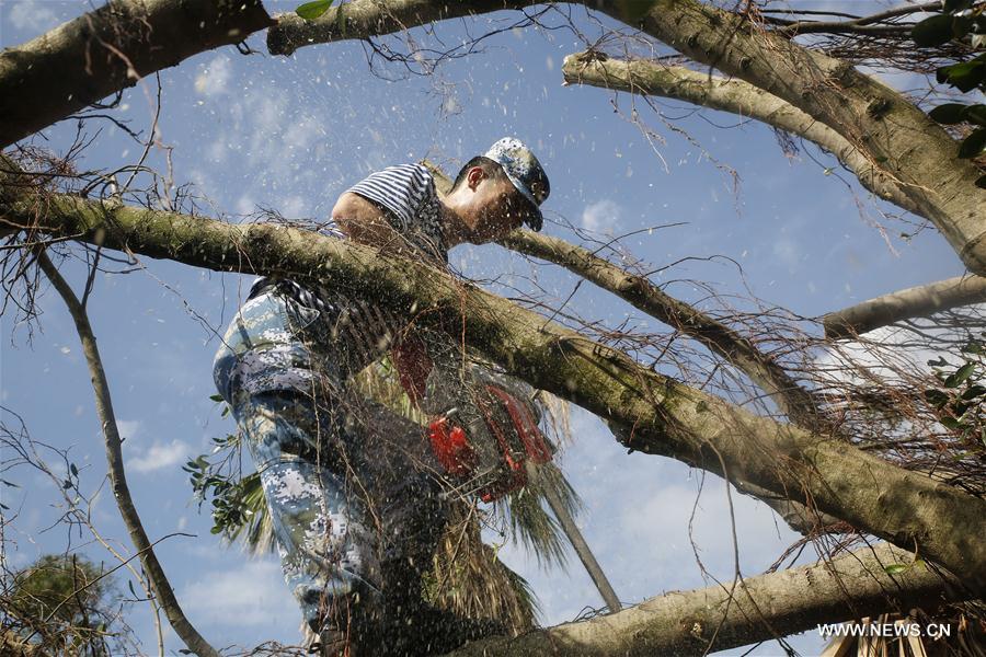 A soldier cleans up fallen trees on a street after Typhoon Meranti swept away and left severe damages, in Xiamen, southeast China's Fujian Province, Sept. 18, 2016. After the typhoon, disaster relief and reconstruction were launched across Fujian Province to bring life back to normal. (Photo/Xinhua)