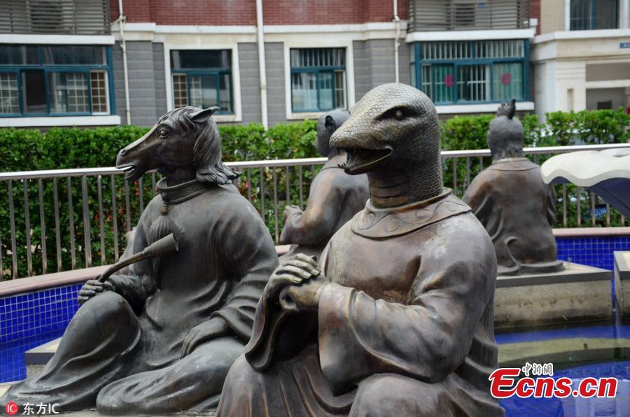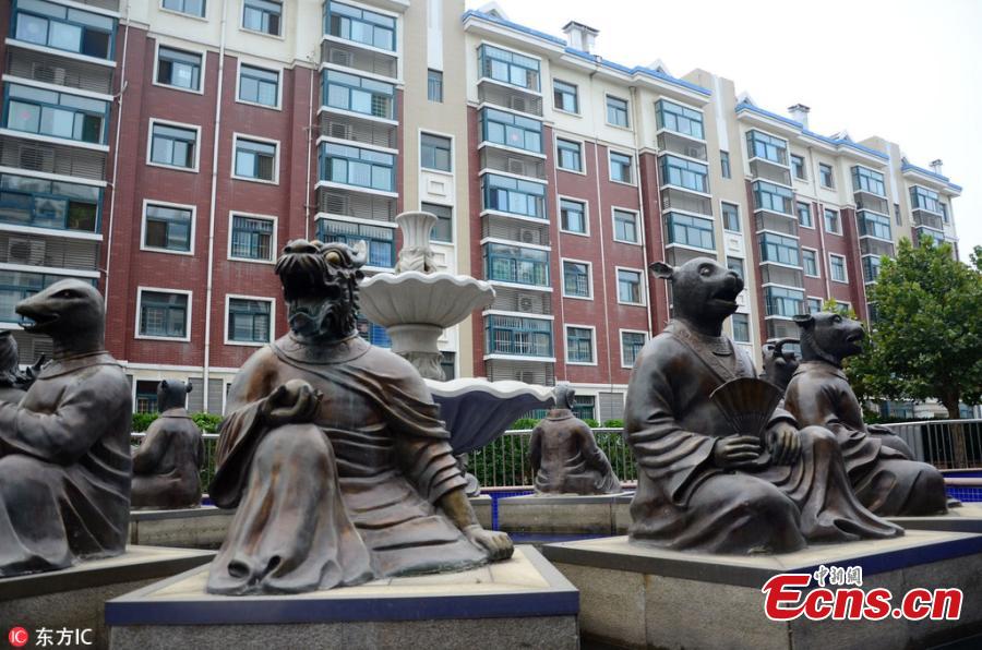 Replicas of 12 zodiac animal heads from the Old Summer Palace are installed at a neighborhood in Weifang City, East China’s Shandong Province, Sept. 19, 2016. Bronze heads of the 12 animals in the Chinese zodiac were originally used to decorate a clepsydra, or water clock, in the imperial summer resort. (Photo/IC)