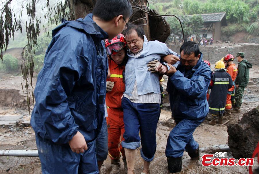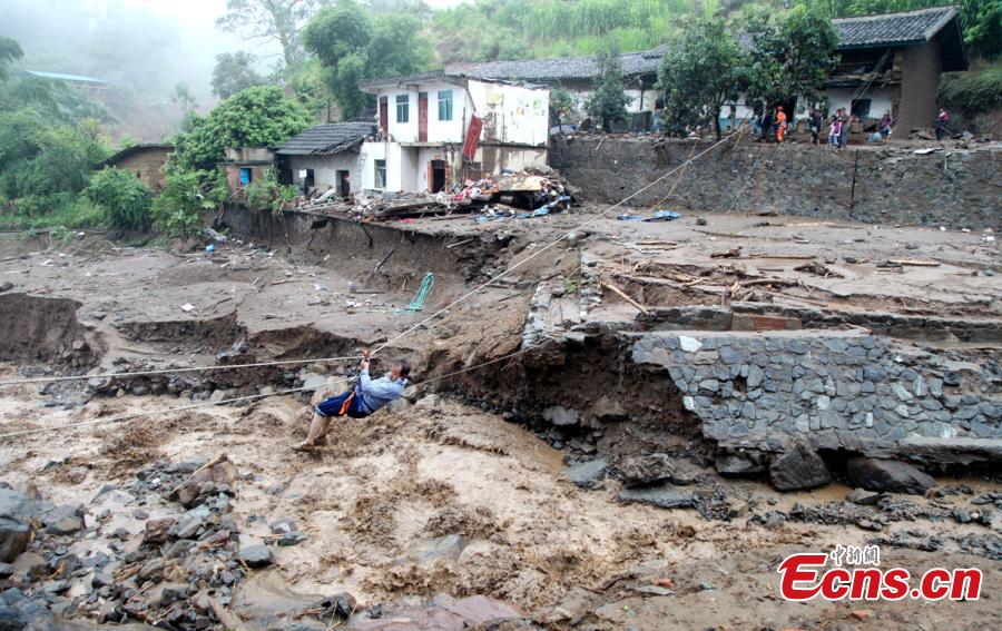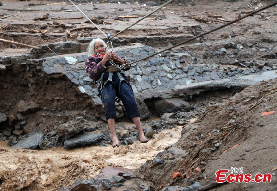 A resident is evacuated to safety in a flood-hit region of Panzhihua City, Southwest China’s Sichuan Province, Sept. 19, 2016. Ten people were killed and six went missing in rainstorms and flooding that also cut off roads, destroyed houses and caused landslides. (Photo: China News Service/Wu Conghao)