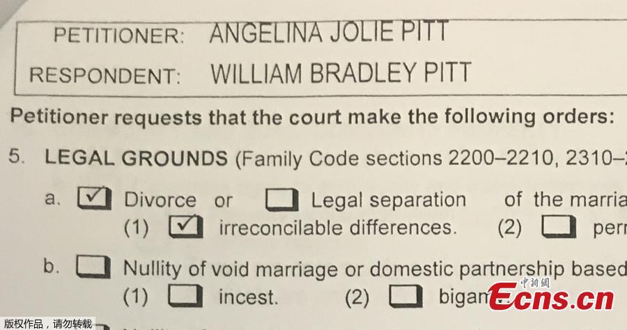 Hollywood actors Brad Pitt and Angelina Jolie arrive for the premiere of his film “World War Z ” in Berlin, Jun. 4, 2013. Angelina Jolie Pitt has filed for divorce from Brad Pitt, her husband of two years, according to a court document. In the document, Jolie Pitt filed for physical custody of the couple's six children and cited irreconcilable differences. (Photo/Agencies)