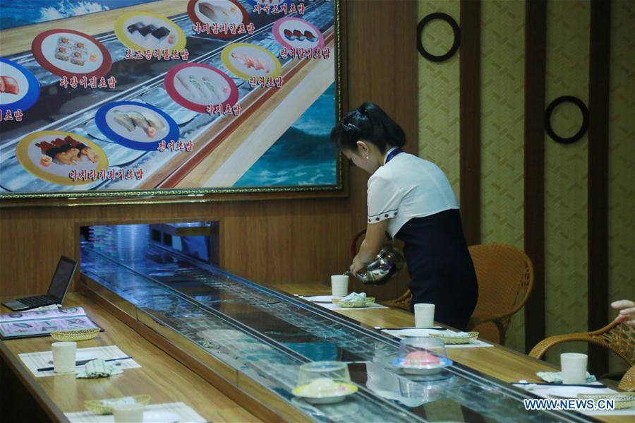A waitress works at a Sushi restaurant in Pyongyang, the Democratic People's Republic of Korea (DPRK), Sept. 21, 2016. The first Sushi restaurant in the DPRK opened for business on Sept. 6. (Xinhua/Zhu Longchuan)
