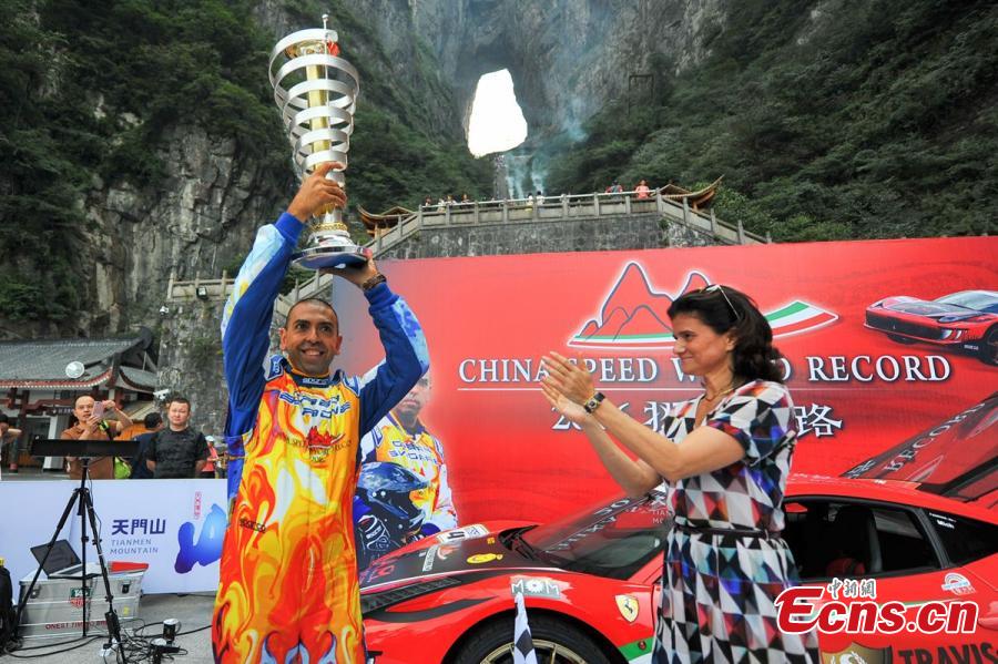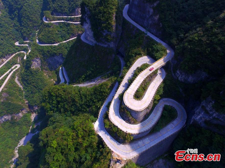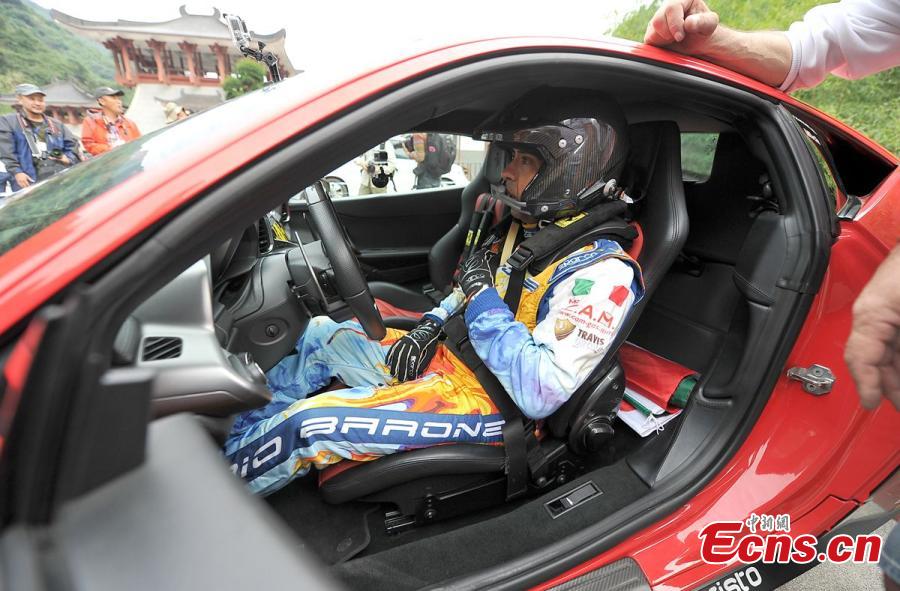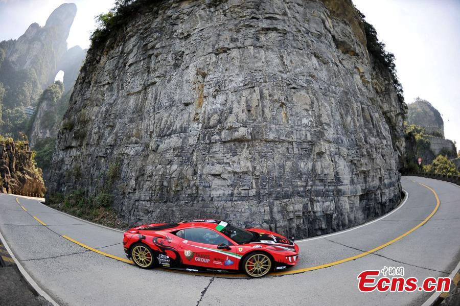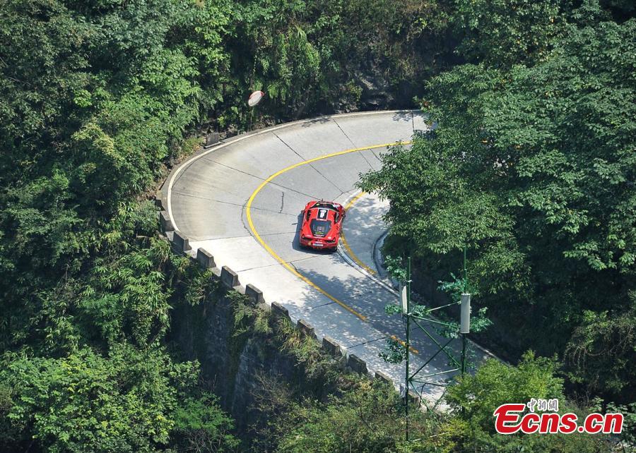Fabio Barone, the president of the 'Red Passion' Ferrari Club of Italy, drives a modified Ferrari on the curvy road to Tianmen Mountain in Zhangjiajie City, Central China’s Hunan Province, Sept. 21, 2016. It took Fabio Barone 10 minutes and 31 seconds to complete the section of tortuous road, which has 99 bends. Some steel parts on the car had been replaced with carbon fiber plates to reduce its weight by 90 kilograms, and some other modifications had been made. (Photo: China News Service/Shao Ying)