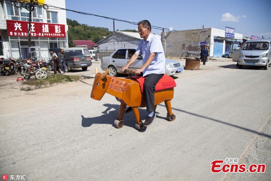 Li Jingyang and his wife ride a homemade wooden ox for fun in Jilin City, Northeast China’s Jilin Province, Sept. 21, 2016. Li, 66, only finished elementary schooling, and worked as a carpenter. Curious about machines and inventions, Li spent eight years making a wooden horse and ox that were able to move and transport items up to 150 kilograms. This was a mini version of the wooden ox Li made. (Photo/IC)
