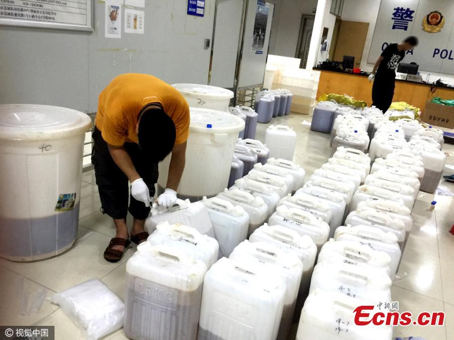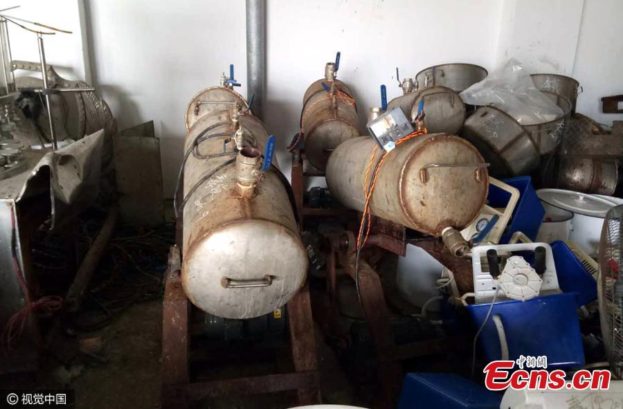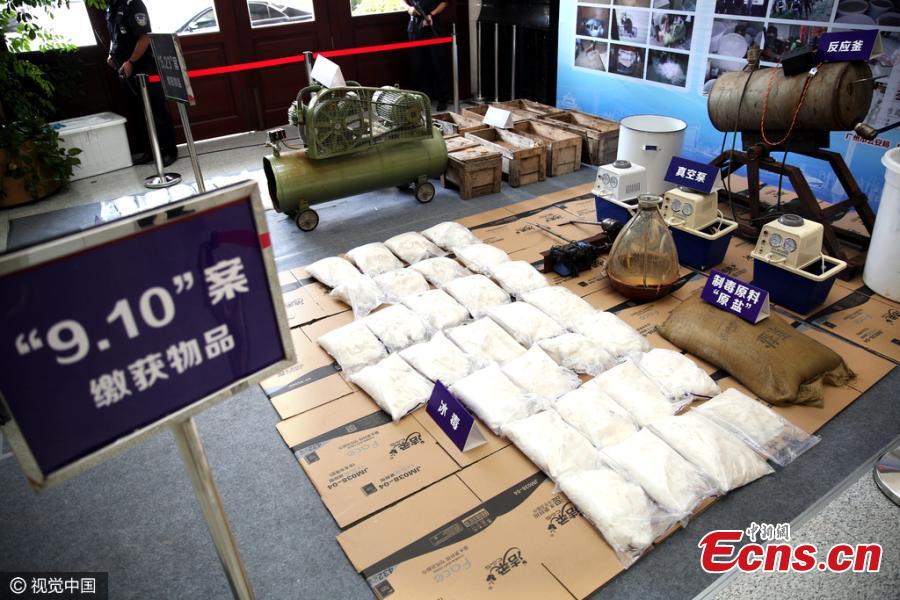 Methamphetamine, and materials and equipment to make drugs are on display at a police press conference in Guangzhou City, the capital of South China’s Guangdong Province, Sept. 21, 2016. Guangzhou police announced they had broken the largest methamphetamine-making case in China this year, seizing 14 suspects and confiscating 2.55 tons of finished as well as half-finished drugs. Equipped with professionals and a complete set of facilities, the crime ring was said to make more than 500 kilograms of methamphetamine in nine days. (Photo/CFP)