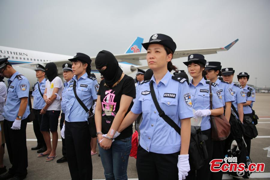 Telecom fraud suspects escorted by Chinese police arrive at an airport in Guangzhou City, the capital of South China’s Guangdong Province, Sept. 22, 2016. Police caught 129 telecom fraud suspects from more than 10 cities in a campaign organized with police in Macao and Hong Kong. The campaign also broke 20 cross-border crime rings, seized a total of 320 suspects, and confiscated guns and drugs. (Photo provided to China News Service)