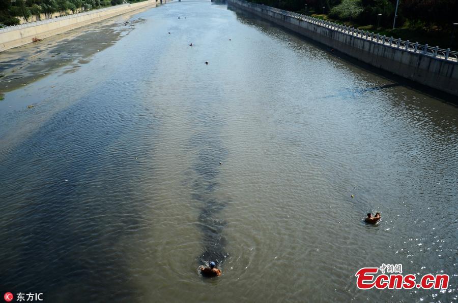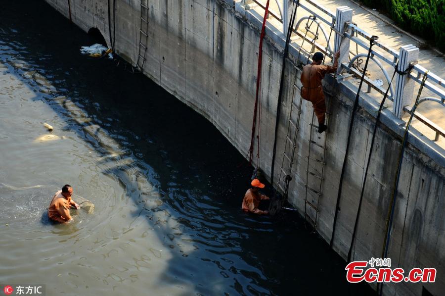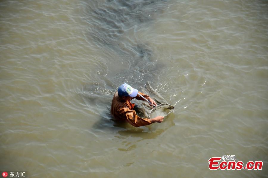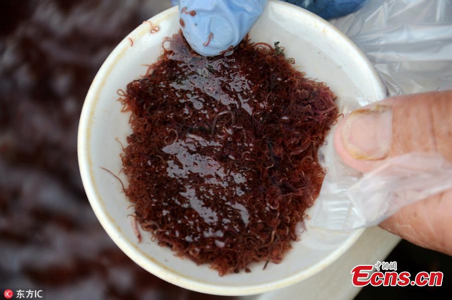 People wearing waterproof suits catch Naididae worms in a stinky river in Jinan City, the capital of East China’s Shandong Province, Sept. 22, 2016. The worms are currently fetching 20 yuan ($3) per kilogram and one person can make about 500 yuan a day catching and selling them. (Photo/IC)